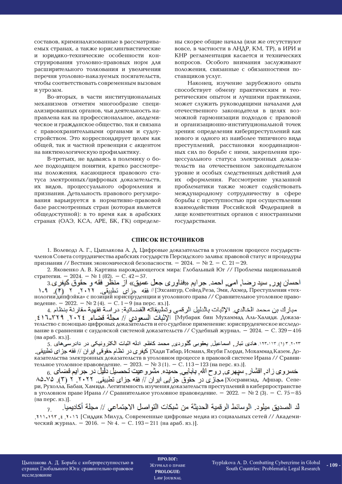 1. Волеводз А. Г., Цыплакова А. Д. Цифровые доказательства в уголовном процессе государств-членов Совета сотрудничества арабских государств Персидского залива: правовой статус и процедуры признания // Вестник экономической безопасности. - 2024. - № 2. - С. 21-29.