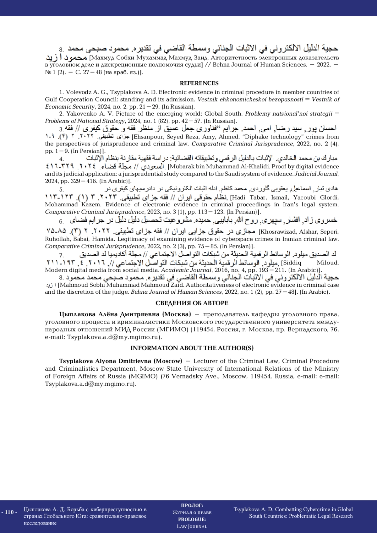 Хосравизад, Афшар, Сепери, Рухолла, Бабаи, Хамида. Легитимность изучения доказательств преступлений в киберпространстве в уголовном праве Ирана // Сравнительное уголовное правоведение. - 2022. - № 2 (3). - С. 75-85 (на перс. яз.).