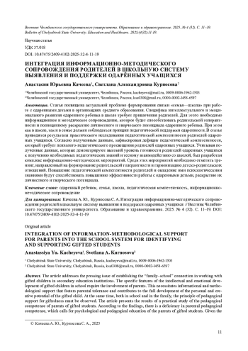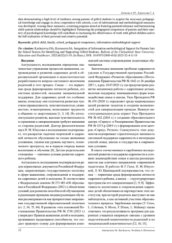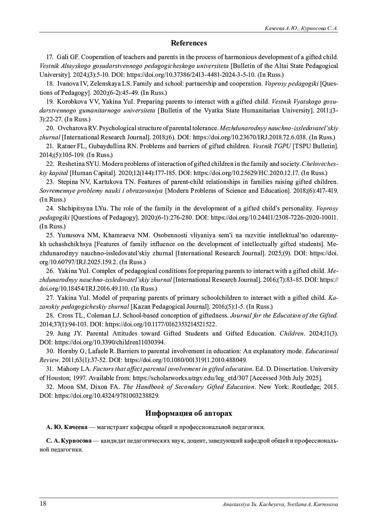 1. Гали Г. Ф. Сотрудничество педагогов и родителей в процессе гармоничного развития одаренного ребенка // Вестник Алтайского государственного педагогического университета. 2024. № 3 (60). С. 5-10. DOI: https://doi.org/10.37386/2413-4481-2024-3-5-10.