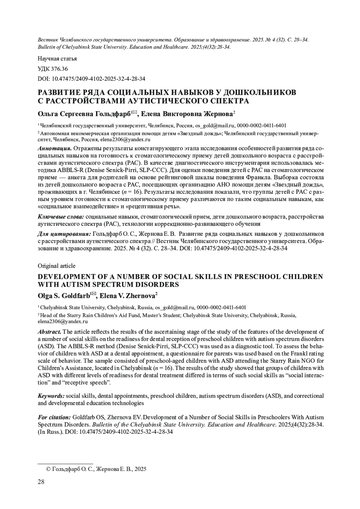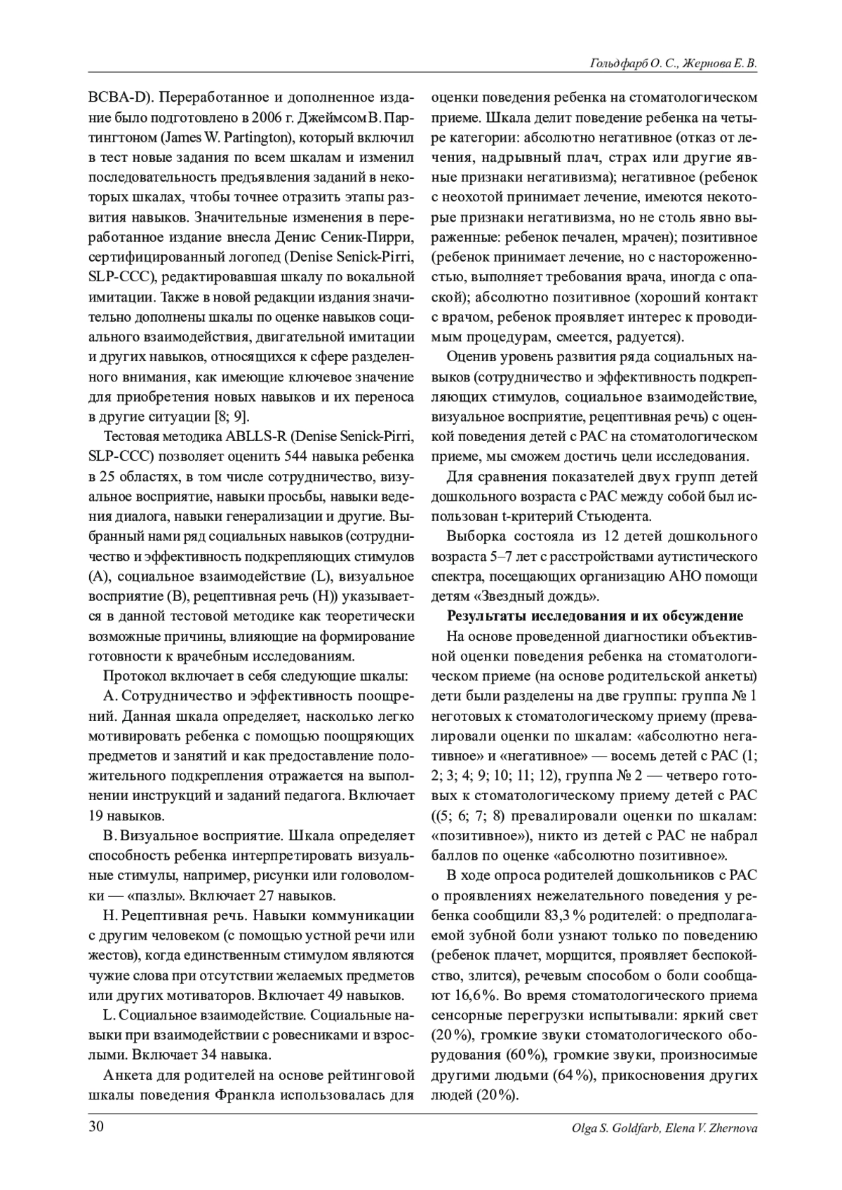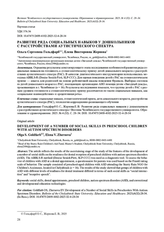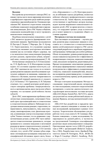 Отражены результаты констатирующего этапа исследования особенностей развития ряда социальных навыков на готовность к стоматологическому приему детей дошкольного возраста с расстройствами аутистического спектра (РАС). В качестве диагностического инструментария использовалась методика ABBLS-R (Denise Senick-Pirri, SLP-CCC). Для оценки поведения детей с РАС на стоматологическом приеме - анкета для родителей на основе рейтинговой шкалы поведения Франкла. Выборка состояла из детей дошкольного возраста с РАС, посещающих организацию АНО помощи детям «Звездный дождь», проживающих в г. Челябинске (n = 16). Результаты исследования показали, что группы детей с РАС с разным уровнем готовности к стоматологическому приему различаются по таким социальным навыкам, как «социальное взаимодействие» и «рецептивная речь».