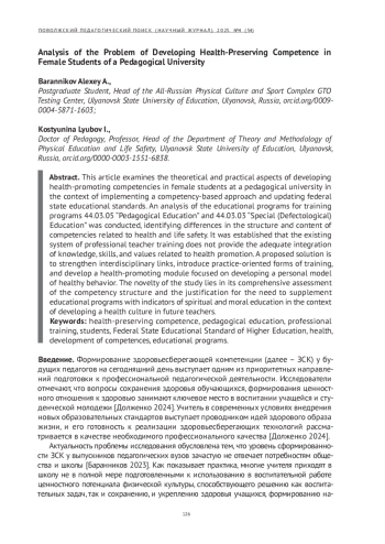 В статье рассматриваются теоретические и практические аспекты формирования здоровьесберегающей компетенции у студенток педагогического вуза в условиях реализации компетентностного подхода и обновления федеральных государственных образовательных стандартов. Проведен анализ образовательных программ направлений подготовки 44.03.05 «Педагогическое образование» и 44.03.03 «Специальное (дефектологическое) образование», выявлены различия в структуре и содержании компетенций, связанных с сохранением здоровья и безопасностью жизнедеятельности. Установлено, что существующая система профессиональной подготовки педагогов не обеспечивает должного уровня интеграции знаний, умений и ценностей здоровьесбережения. В качестве пути решения предлагается усиление междисциплинарных связей, внедрение практико-ориентированных форм обучения и развитие здоровьесберегающего модуля, ориентированного на формирование личностной модели здорового поведения. Новизна исследования заключается в комплексной оценке структуры компетенций и обосновании необходимости дополнения образовательных программ индикаторами духовно-нравственного воспитания в контексте формирования культуры здоровья будущего педагога.