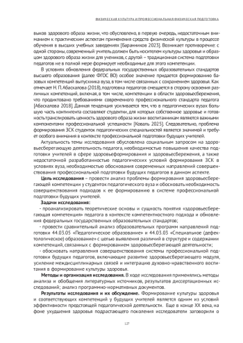 Формирование здоровьесберегающей компетенции (далее – ЗСК) у будущих педагогов на сегодняшний день выступает одним из приоритетных направлений подготовки к профессиональной педагогической деятельности. Исследователи отмечают, что вопросы сохранения здоровья обучающихся, формирования ценностного отношения к здоровью занимают ключевое место в воспитании учащейся и студенческой молодежи [Долженко 2024].