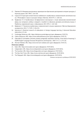 12. Павлова Е. Б. Жанрово-дискурсивные характеристики британского ресторанного интернет-дискурса // Научный диалог. 2017. №8. С. 116-130.