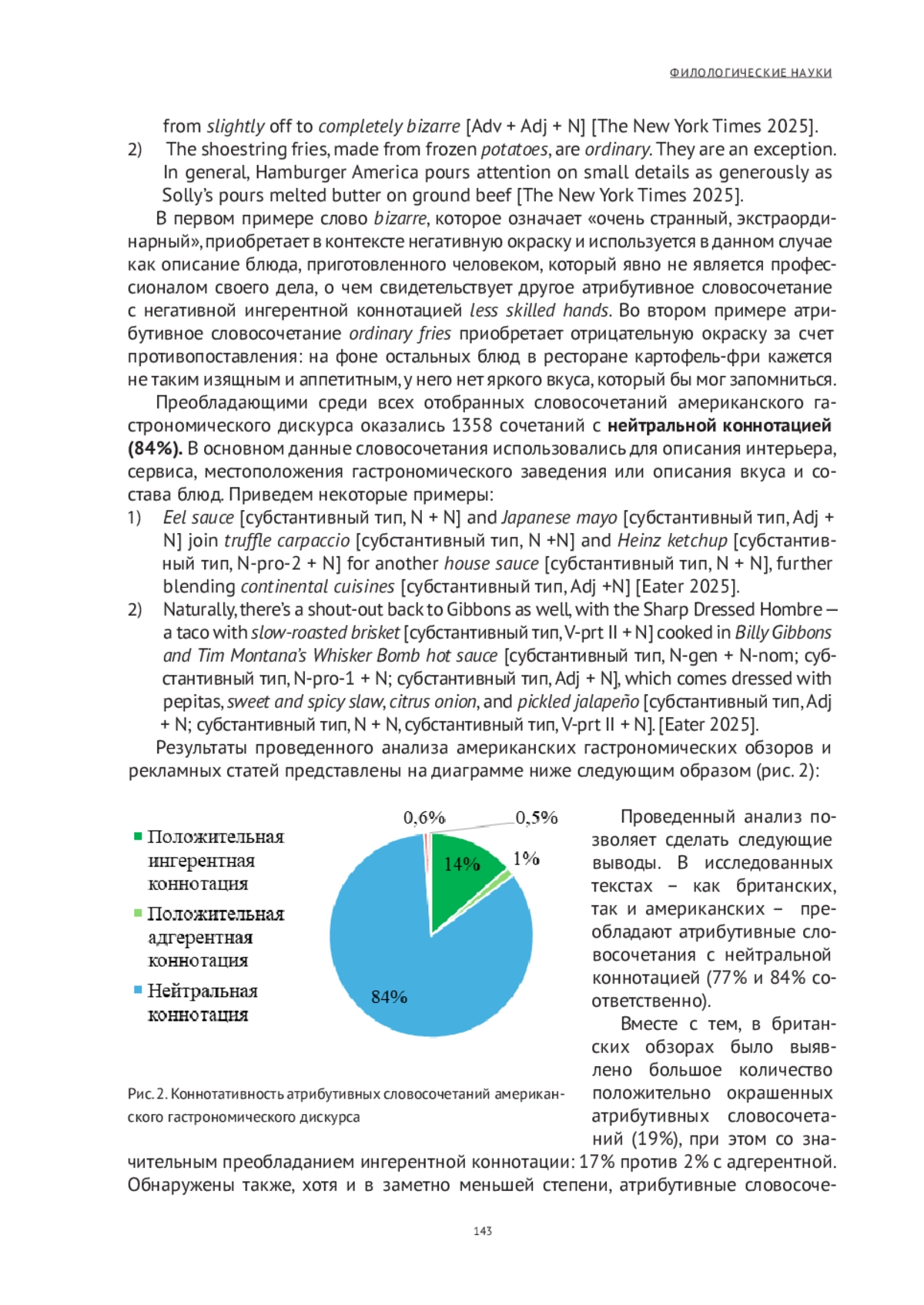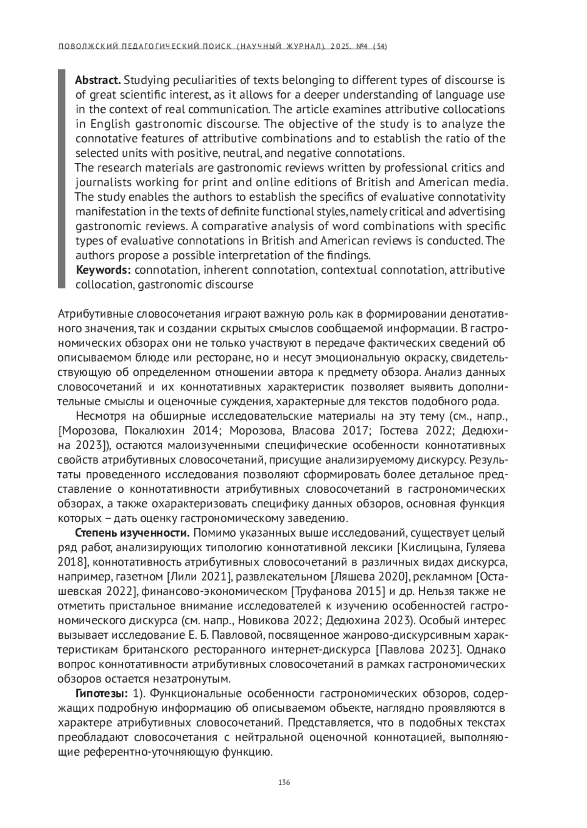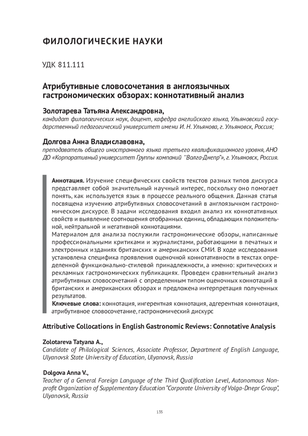 Изучение специфических свойств текстов разных типов дискурса представляет собой значительный научный интерес, поскольку оно помогает понять, как используется язык в процессе реального общения. Данная статья посвящена изучению атрибутивных словосочетаний в англоязычном гастрономическом дискурсе. В задачи исследования входил анализ их коннотативных свойств и выявление соотношения отобранных единиц, обладающих положительной, нейтральной и негативной коннотациями. Материалом для анализа послужили гастрономические обзоры, написанные профессиональными критиками и журналистами, работающими в печатных и электронных изданиях британских и американских СМИ. В ходе исследования установлена специфика проявления оценочной коннотативности в текстах определенной функционально-стилевой принадлежности, а именно: критических и рекламных гастрономических публикациях. Проведен сравнительный анализ атрибутивных словосочетаний с определенным типом оценочных коннотаций в британских и американских обзорах и предложена интерпретация полученных результатов.