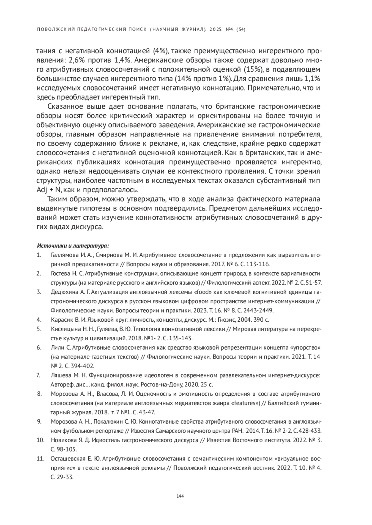 11. Осташевская Е. Ю. Атрибутивные словосочетания с семантическим компонентом «визуальное восприятие» в тексте англоязычной рекламы // Поволжский педагогический вестник. 2022. Т. 10. №4. С. 29-33.