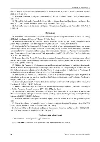 1. Bar-On R. Emotional Intelligence Inventory (EQ-i): Technical Manual. Canada : Multy-Health System, 997. 120 p. 1. Mayer J. D., Salovey P., Caruso D. R. Mayer-Salovey-Caruso Emotional Intelligence.Intelligence Test MSCEIT) User’s Manual. Toronto, Canada : MHS Publishers, 2002. 195 p. 2. Salovey P., Mayer J. D. Emotional intelligence // Imagination, Cognition, and Personality. 1990. Vol. 9. P. 185-211.