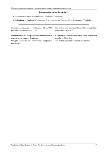 В статье отражены результаты пилотажного эмпирического исследования, проведенного на социальной выборке женщин города Челябинска и Челябинской области в возрасте от 18 до 49 лет (N = 30). Для выявления особенностей пищевого поведения у женщин с разным уровнем эмоционального интеллекта нами были использованы стандартизированные методики: тест эмоционального интеллекта Мэйер - Сэловей - Карузо; голландский опросник DEBQ; опросник EAT-26; шкала оценки пищевого поведения (Станкарда). Сравнение трех групп (с низким, средним и высоким эмоциональным интеллектом) выявило нелинейный характер этой связи. Установлено, что наиболее высокие риски нарушений пищевого поведения характерны для группы женщин со средним уровнем ЭИ: у них выявлено максимальное стремление к худобе (p = 0,001), наивысший общий риск расстройств (p = 0,040) и выраженное экстернальное пищевое поведение (p = 0,009). В отличие от них женщины с высоким ЭИ демонстрируют адаптивный профиль - осознанный контроль питания (ограничительное поведение, p = 0,003) и низкую зависимость от внешних стимулов. Для группы с низким ЭИ характерны интероцептивная некомпетентность (p = 0,042) и перфекционизм (p = 0,023). Полученные данные подчеркивают, что средний уровень ЭИ может являться «зоной уязвимости» для формирования дезадаптивных пищевых установок, что важно учитывать при разработке дифференцированных психологических программ профилактики и коррекции.