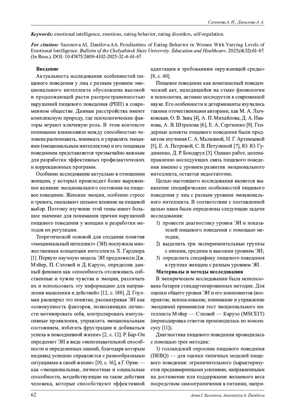 8. Петрова Е. А., Петунина С. В. Особенности эмоционального интеллекта женщин с нарушением пищевого поведения // Наукосфера. 2021. № 1 (1). С. 114-118.