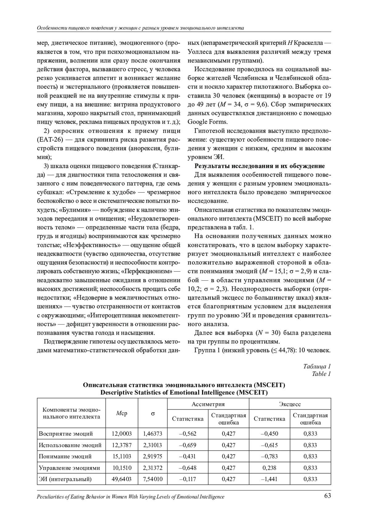 Актуальность исследования особенностей пищевого поведения у лиц с разным уровнем эмоционального интеллекта обусловлена высокой и продолжающей расти распространенностью нарушений пищевого поведения (РПП) в современном обществе. Данные расстройства имеют комплексную природу, где психологические факторы играют ключевую роль. В этом контексте понимание взаимосвязи между способностью человека распознавать, понимать и управлять эмоциями (эмоциональным интеллектом) и его пищевым поведением представляется чрезвычайно важным для разработки эффективных профилактических и коррекционных программ.