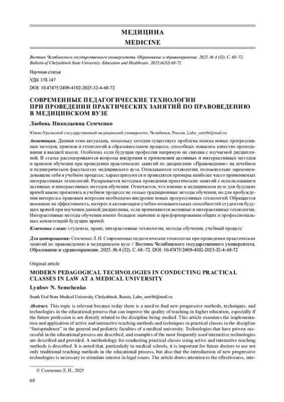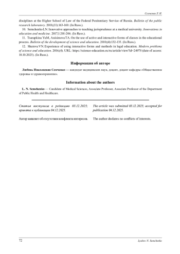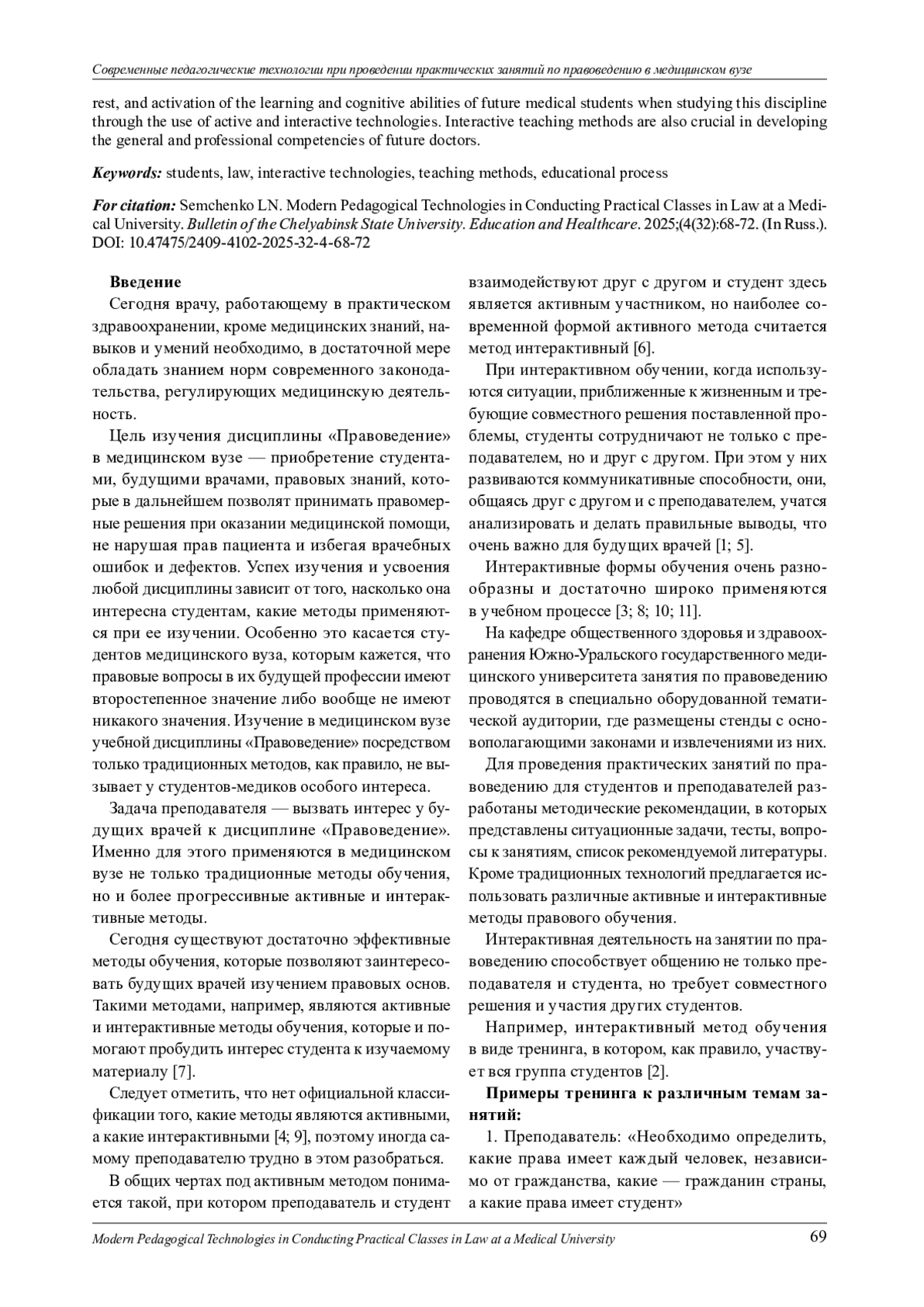 10. Семченко Л. Н. Инновационные подходы к преподаванию правоведения в медицинском университете // Инновации в образовании и медицине. Махачкала, 2017. Т. 1. С. 201-206.
