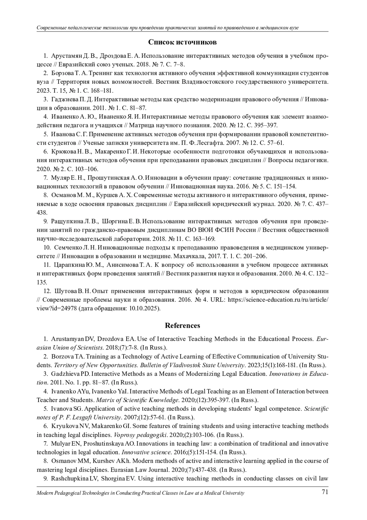 12. Шутова В. Н. Опыт применения интерактивных форм и методов в юридическом образовании / Современные проблемы науки и образования. 2016. № 4. URL: https://science-education.ru/ru/article/view?id=24978 (дата обращения: 10.10.2025).