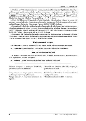 2. Данилова А. С. Инфраструктура вуза: содержание, структура и влияние цифровизация // Актуальные проблемы модернизации высшей школы: высшее образование в информационном обществе: материалы ХХХII Международной научно-методической конференции, Новосибирск, 27 января 2021 года. Новосибирск: Сибирский государственный университет путей сообщения, 2021. С. 144-147.