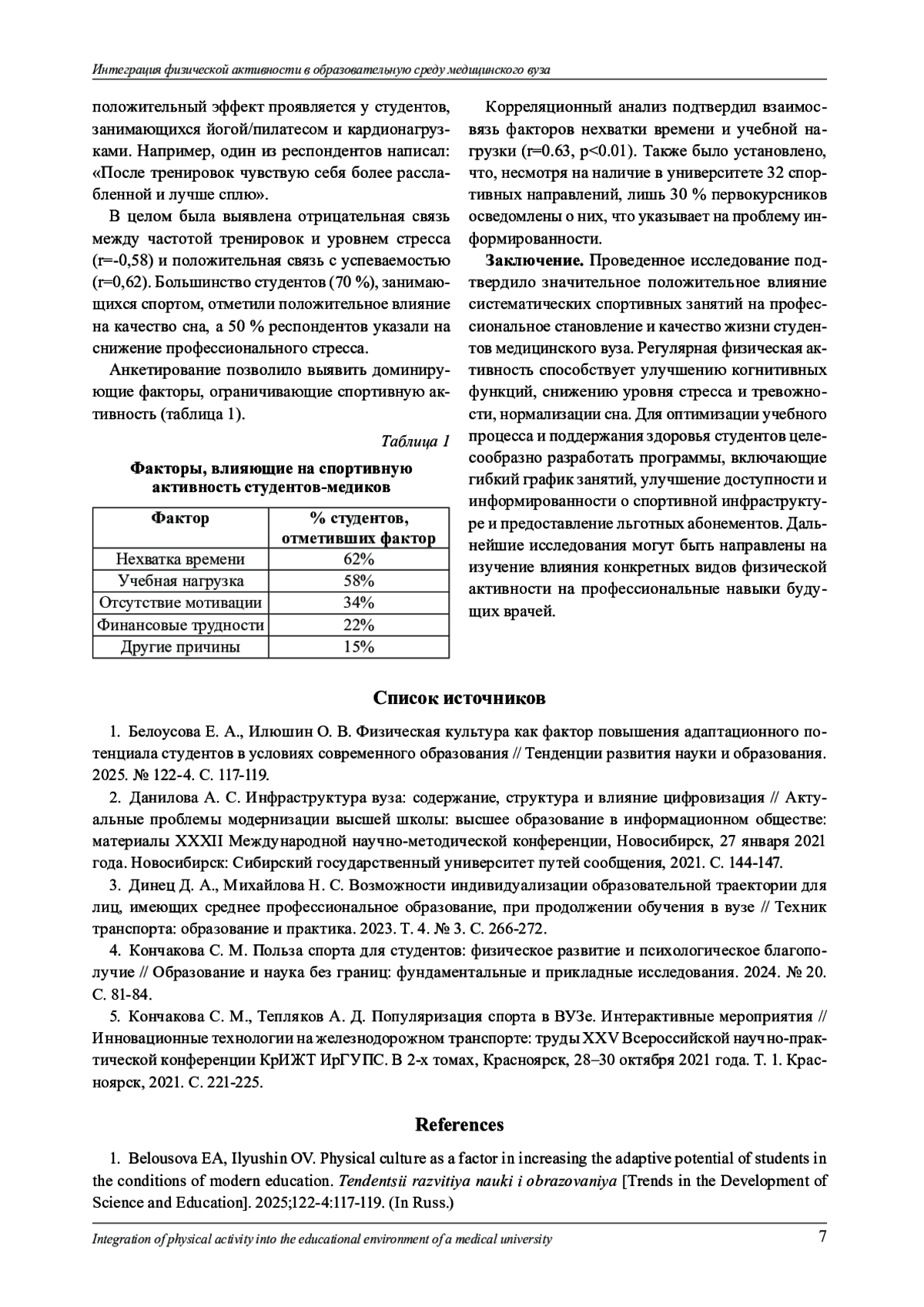 Статья отражает результаты исследования потребностей студентов медицинского вуза в физической активности и ее влияния на академическую успеваемость, психоэмоциональное состояние и профессиональное становление. В качестве диагностического инструментария использовалось анкетирование. Для статистического анализа данных использовались методы описательной статистики и корреляционный анализ. Выборка состояла из студентов РНИМУ им. Н. И. Пирогова (n=200). Результаты исследования показали, что систематические занятия спортом положительно коррелируют с успеваемостью (r=0,62) и демонстрируют отрицательную связь с уровнем стресса (r=-0,58). Доминирующими барьерами для физической активности являются высокая учебная нагрузка и нехватка времени. Разработаны практические рекомендации по интеграции физической активности в образовательную среду медицинского вуза.