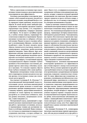 В рукописи раскрывается действенность и универсальность интегративного подхода при работе с кризисными состояниями через имагинативные техники в современной психотерапии. Доказывается, что кататимно-имагинативная психотерапия позволяет в полной мере реализовать принцип индивидуального подхода к каждому пациенту, предоставляя возможность учитывать не только характер его психических расстройств, но и личностные особенности, такие как уровень интеллекта, эмоциональное состояние, а также поведение. Обосновывается, что универсальность кататимно-имагинативной психотерапии проявляется в ее эффективности при лечении широкого спектра психологических проблем. Раскрывается, что кататимно-имагинативную психотерапию можно интегрировать как диагностический и терапевтический инструмент в долгосрочные методы лечения, направленные на изменение структуры характера человека.