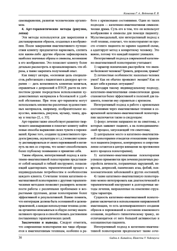 2. Алмагамбетова А. А., Акименко Г. В., Кирина Ю. Ю. [и др.] Арт-психотерапия: дополнительное лечение постравматических стрессовых расстройств, депрессии и тревожности в период пандемии // Дневник науки. 2023. Т. 11, № 83. С. 31-38.
