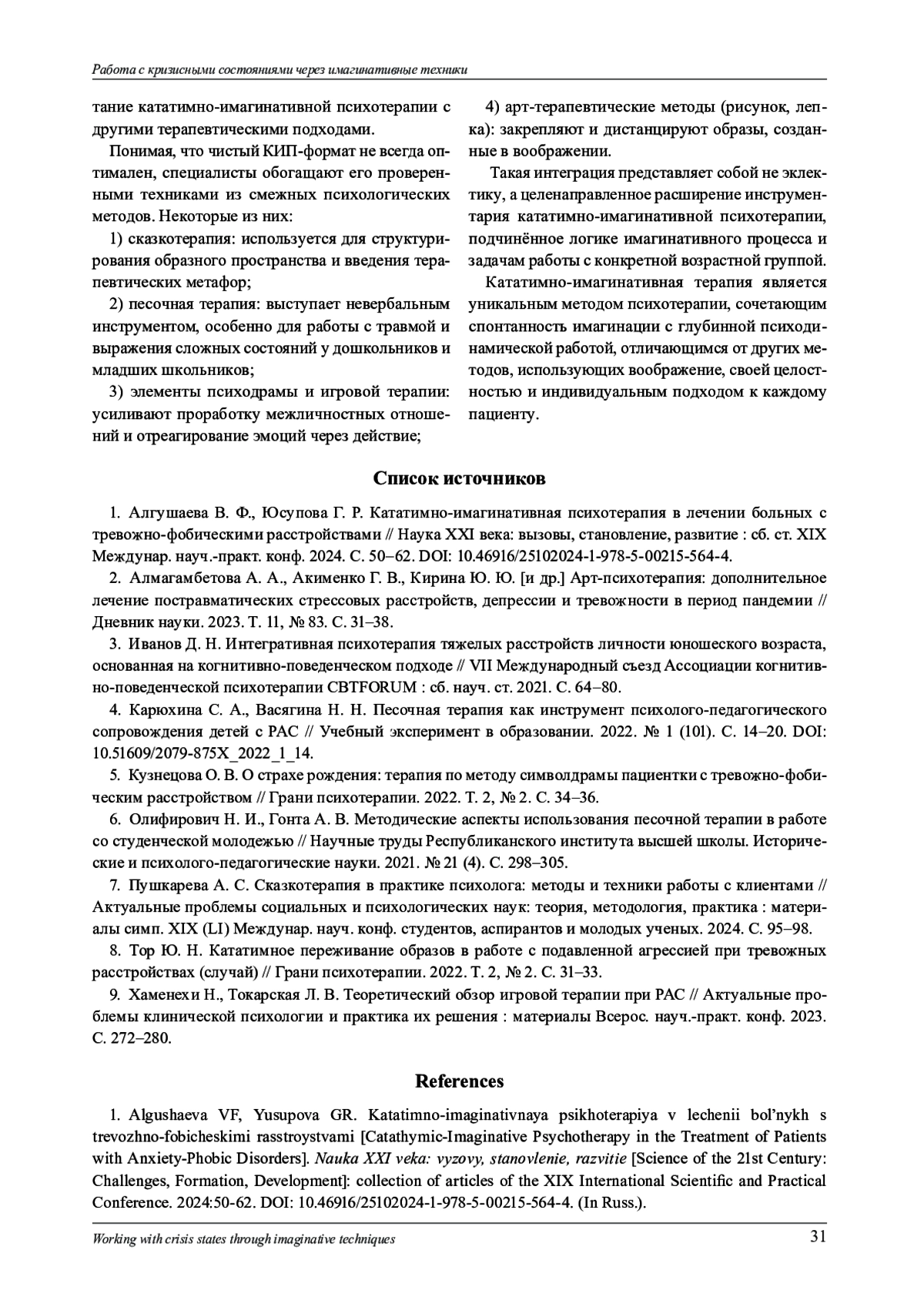 1. Алгушаева В. Ф., Юсупова Г. Р. Кататимно-имагинативная психотерапия в лечении больных с тревожно-фобическими расстройствами // Наука XXI века: вызовы, становление, развитие : сб. ст. XIX Междунар. науч.-практ. конф. 2024. С. 50-62. DOI: 10.46916/25102024-1-978-5-00215-564-4.