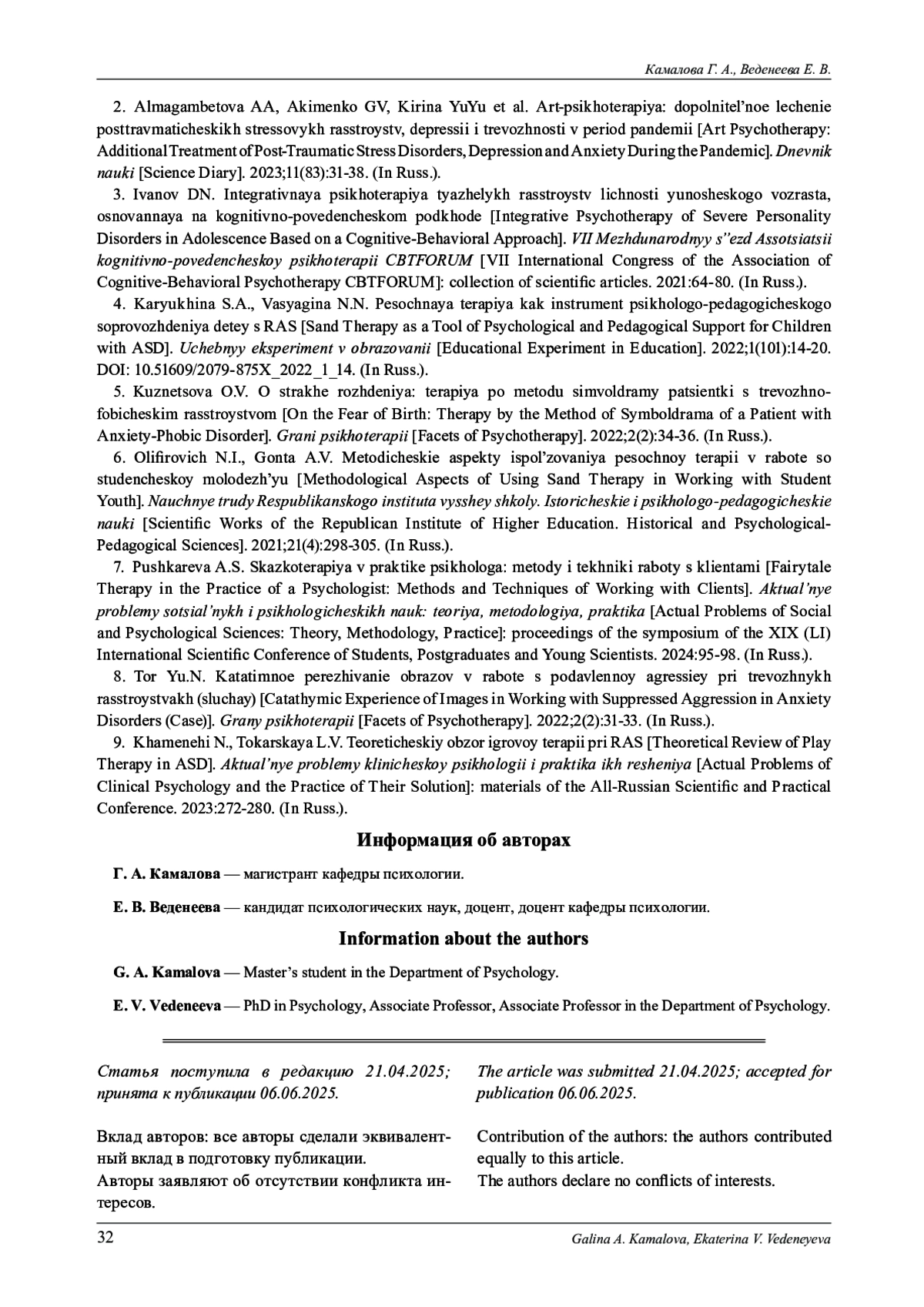 9. Хаменехи Н., Токарская Л. В. Теоретический обзор игровой терапии при РАС // Актуальные про- 9блемы клинической психологии и практика их решения : материалы Всерос. науч.-практ. конф. 2023. С. 272-280.