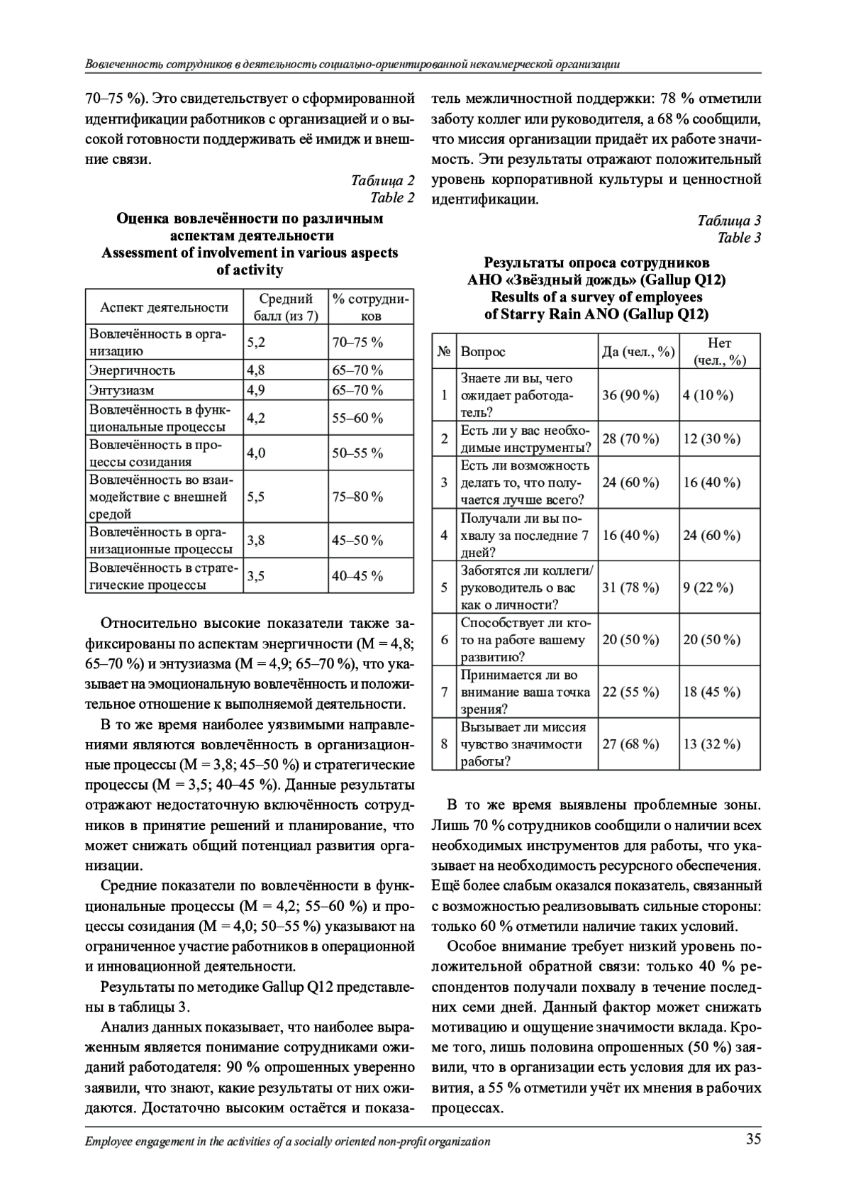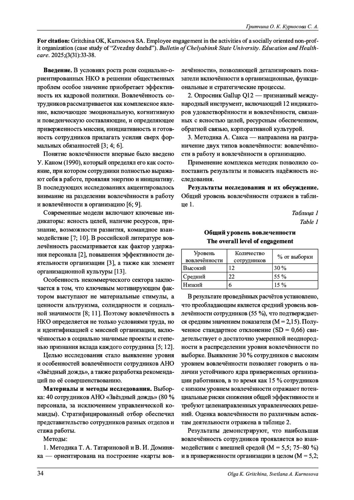 В статье представлены результаты исследования вовлечённости сотрудников в деятельность социально-ориентированной некоммерческой организации (СО НКО) на примере АНО «Звёздный дождь» ( г. Челябинск). Вовлечённость рассматривается как ключевой фактор эффективности НКО, влияющий на качество оказываемых услуг и устойчивость организации. В качестве диагностического инструментария использовались: методика оценки вовлечённости Т. А. Татариновой и В. И. Доминяка, опросник Gallup Q12, методика А. Сакса. В исследовании приняли участие 40 сотрудников организации (80 % персонала, за исключением управленческой команды). Результаты показали, что большинство сотрудников (55 %) характеризуются средним уровнем вовлечённости, 30 % - высоким, а 15 % - низким. Наибольшая вовлечённость зафиксирована в аспектах взаимодействия с внешней средой и идентификации с миссией организации, наименьшая - в стратегических и организационных процессах. Сделан вывод о необходимости развития систем мотивации, признания и вовлечения сотрудников в процессы принятия решений.