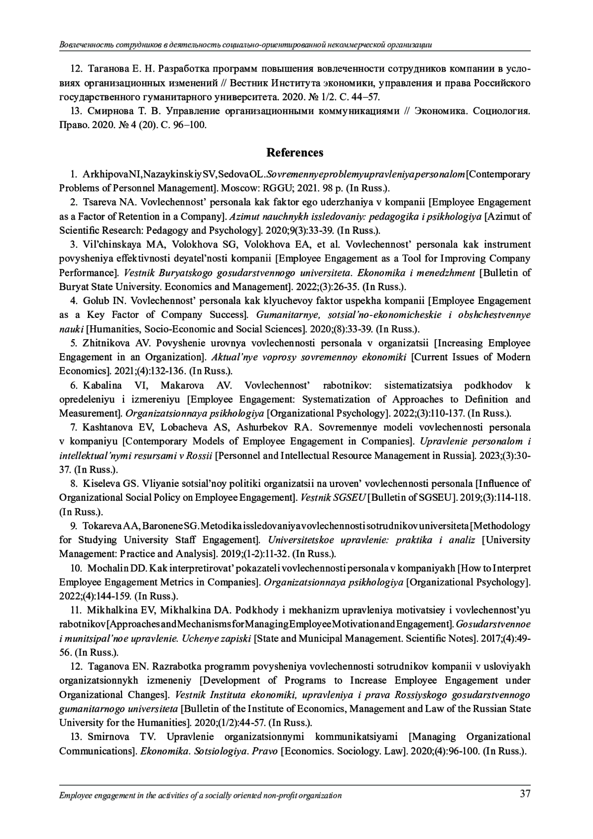 12. Таганова Е. Н. Разработка программ повышения вовлеченности сотрудников компании в условиях организационных изменений // Вестник Института экономики, управления и права Российского государственного гуманитарного университета. 2020. № 1/2. С. 44-57.