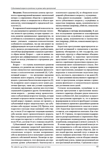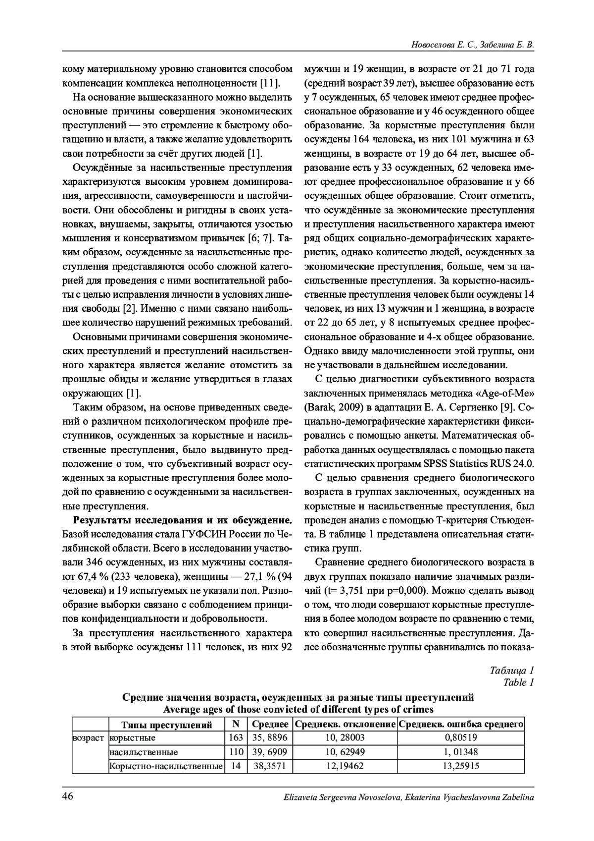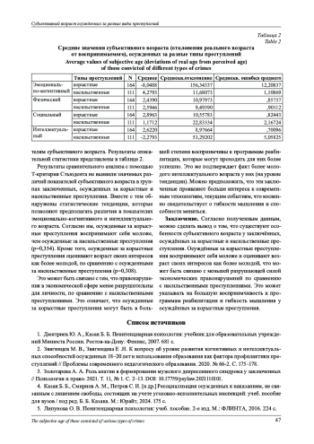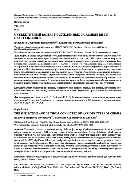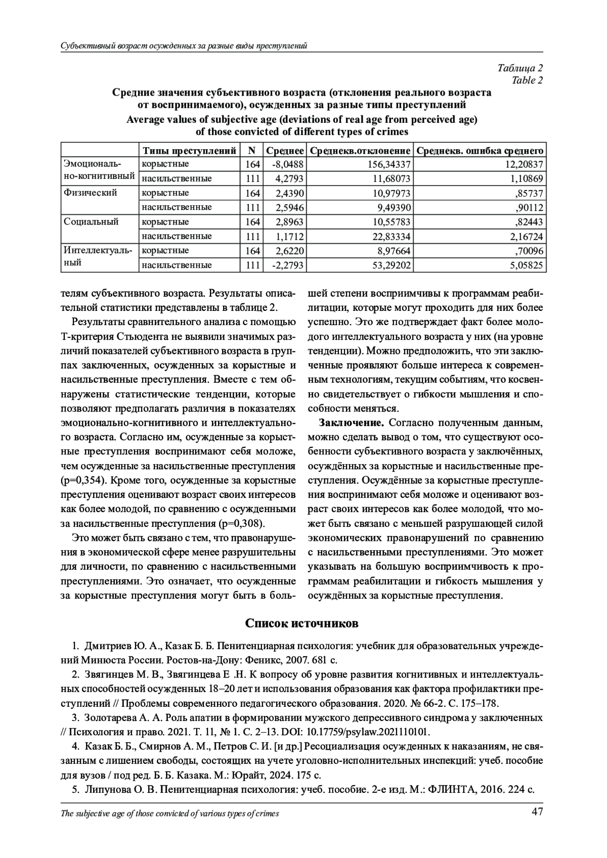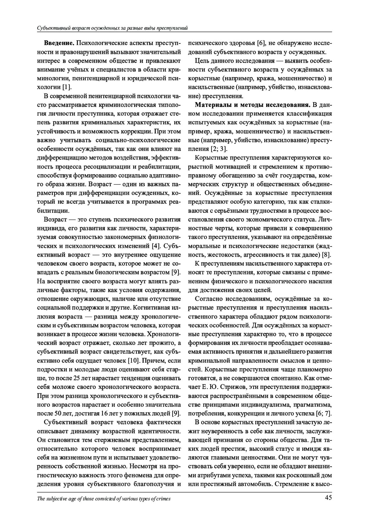 В статье представлены результаты исследования субъективного возраста заключенных, осужденных за различные виды преступлений, насильственных и корыстных. Под субъективным возрастом понимают внутреннее ощущение человеком своего возраста, которое может не совпадать с реальным биологическим возрастом. Цель исследования - изучить особенности субъективного возраста у осуждённых за корыстные и насильственные преступления с учётом их социально-демографических характеристик. В результате (N=296) выявлены значимые различия в показателях субъективного возраста между заключёнными, осуждёнными за корыстные и насильственные преступления. Осуждённые за корыстные преступления воспринимают себя моложе и оценивают возраст своих интересов как более молодой, что может быть связано с меньшей разрушающей силой для личности экономических правонарушений по сравнению с насильственными преступлениями. Это также может указывать на более выраженную гибкость мышления и большую восприимчивость к программам реабилитации у осуждённых за корыстные преступления