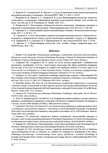 6. Новоселова Е. С., Забелина Е. В. 6. Петров В. И., Скугаревская Е. И., Вальчук Э. А. [и др.] Комплексная оценка предикторов развития расстройств адаптации у осужденных // Вестник ВГМУ. 2006. Т. 5, № 4. С. 84-93.