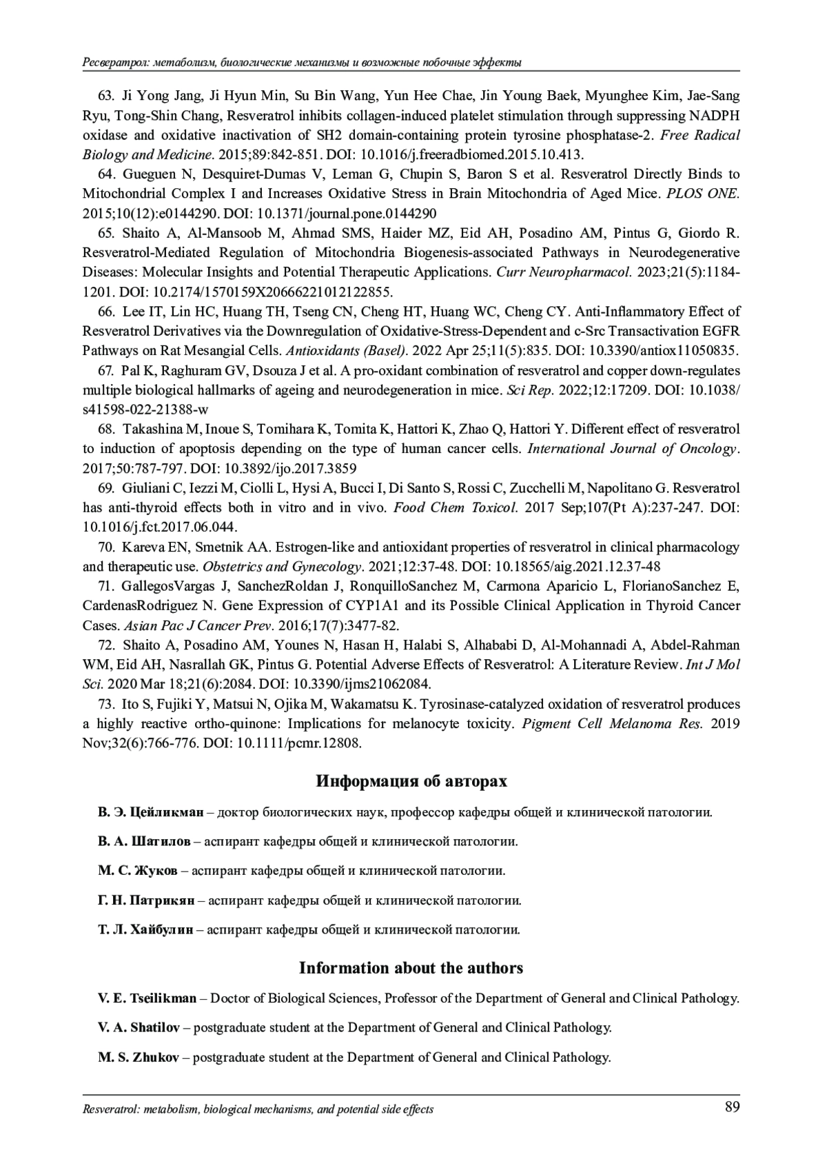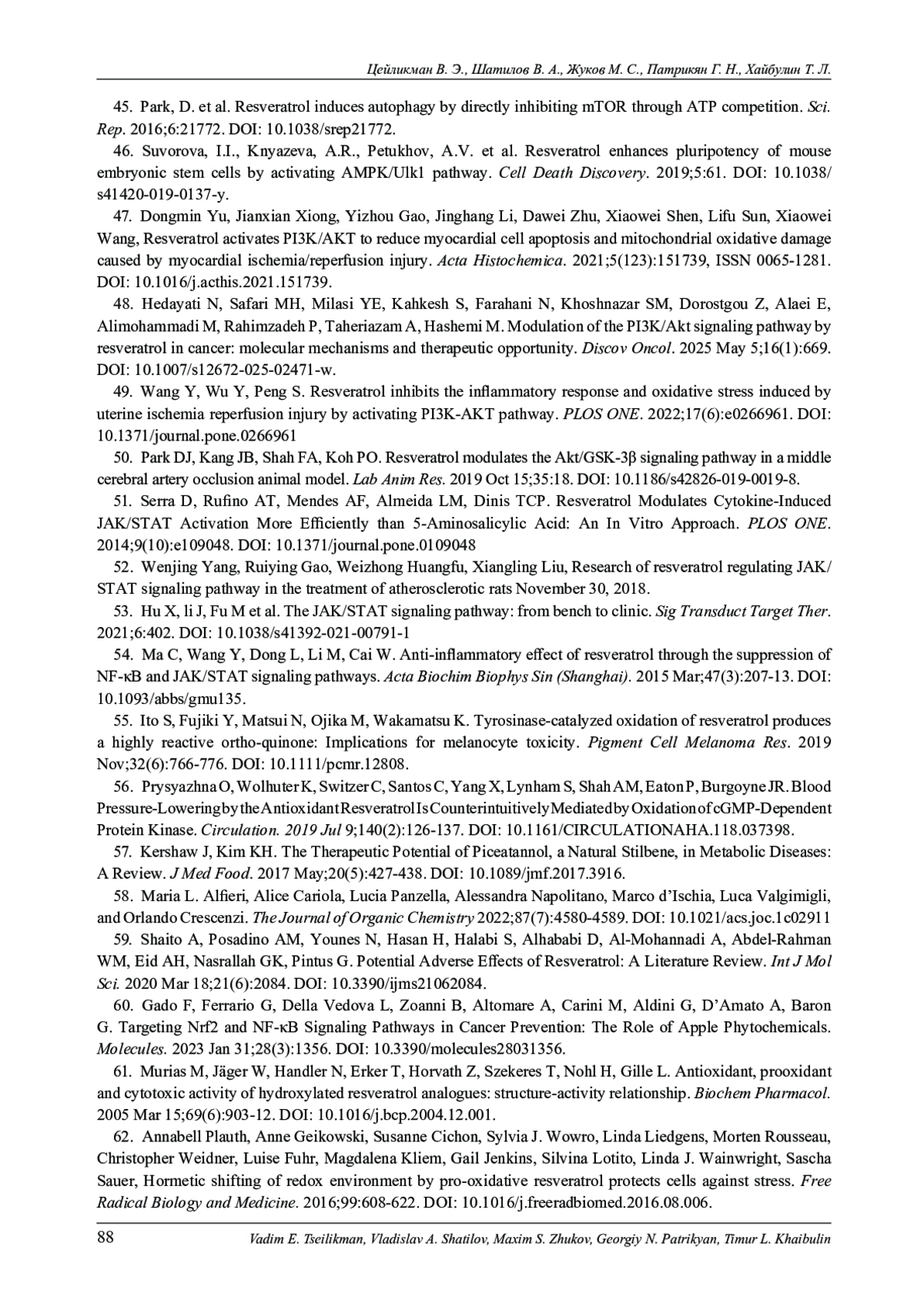 48. Hedayati N., Safari M. H., Milasi Y. E., Kahkesh S., Farahani N., Khoshnazar S. M., Dorostgou Z., Цейликман В. Э., Шатилов В. А., Жуков М. С., Патрикян Г. Н., Хайбулин Т. Л. Alaei E., Alimohammadi M., Rahimzadeh P., Taheriazam A., Hashemi M. Modulation of the PI3K/Akt signaling pathway by resveratrol in cancer: molecular mechanisms and therapeutic opportunity. Discov Oncol. 2025 May 5;16(1):669. DOI: 10.1007/s12672-025-02471-w.