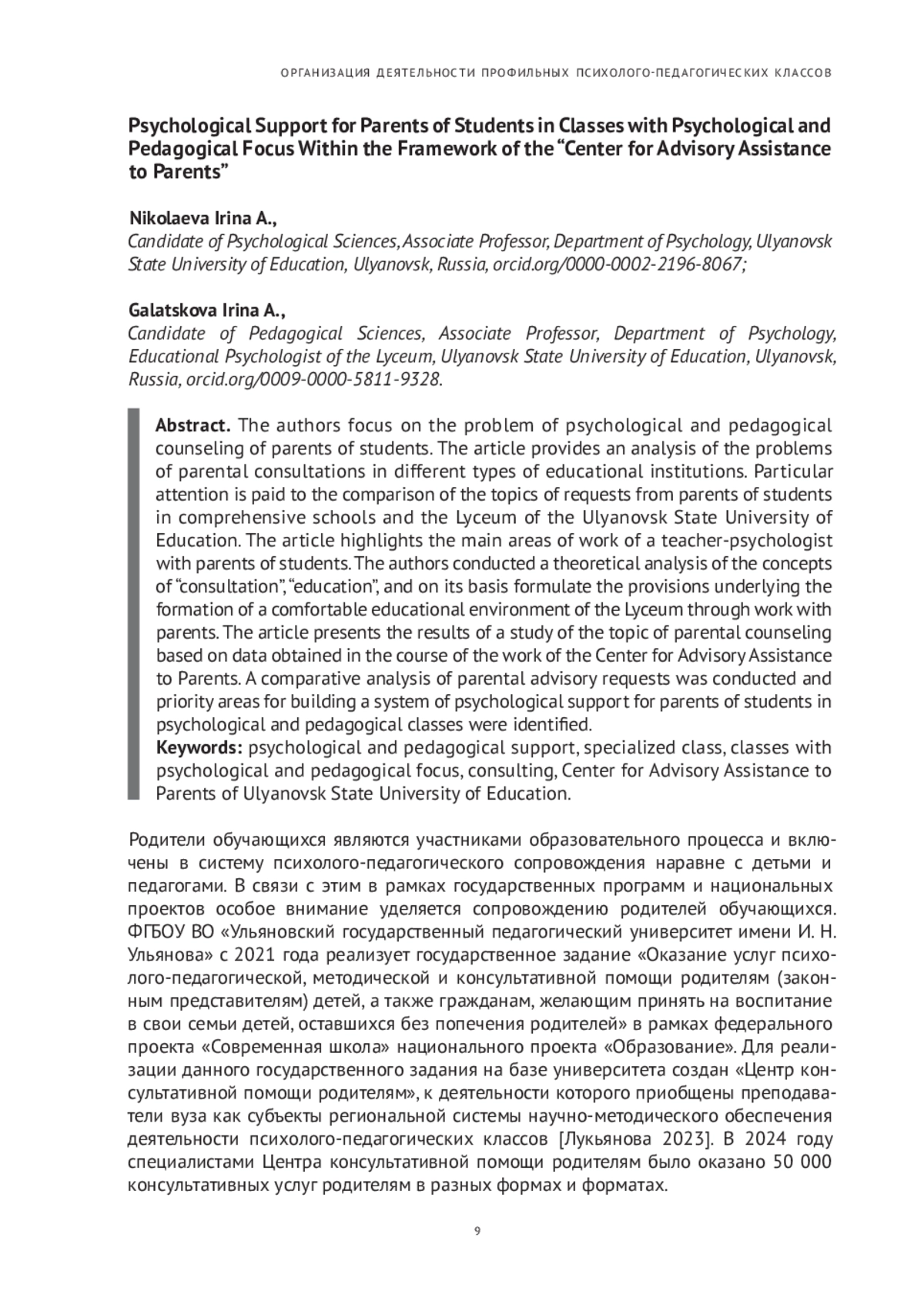Родители обучающихся являются участниками образовательного процесса и включены в систему психолого-педагогического сопровождения наравне с детьми и педагогами. В связи с этим в рамках государственных программ и национальных проектов особое внимание уделяется сопровождению родителей обучающихся. ФГБОУ ВО «Ульяновский государственный педагогический университет имени И. Н. Ульянова» с 2021 года реализует государственное задание «Оказание услуг психолого-педагогической, методической и консультативной помощи родителям (законным представителям) детей, а также гражданам, желающим принять на воспитание в свои семьи детей, оставшихся без попечения родителей» в рамках федерального проекта «Современная школа» национального проекта «Образование».