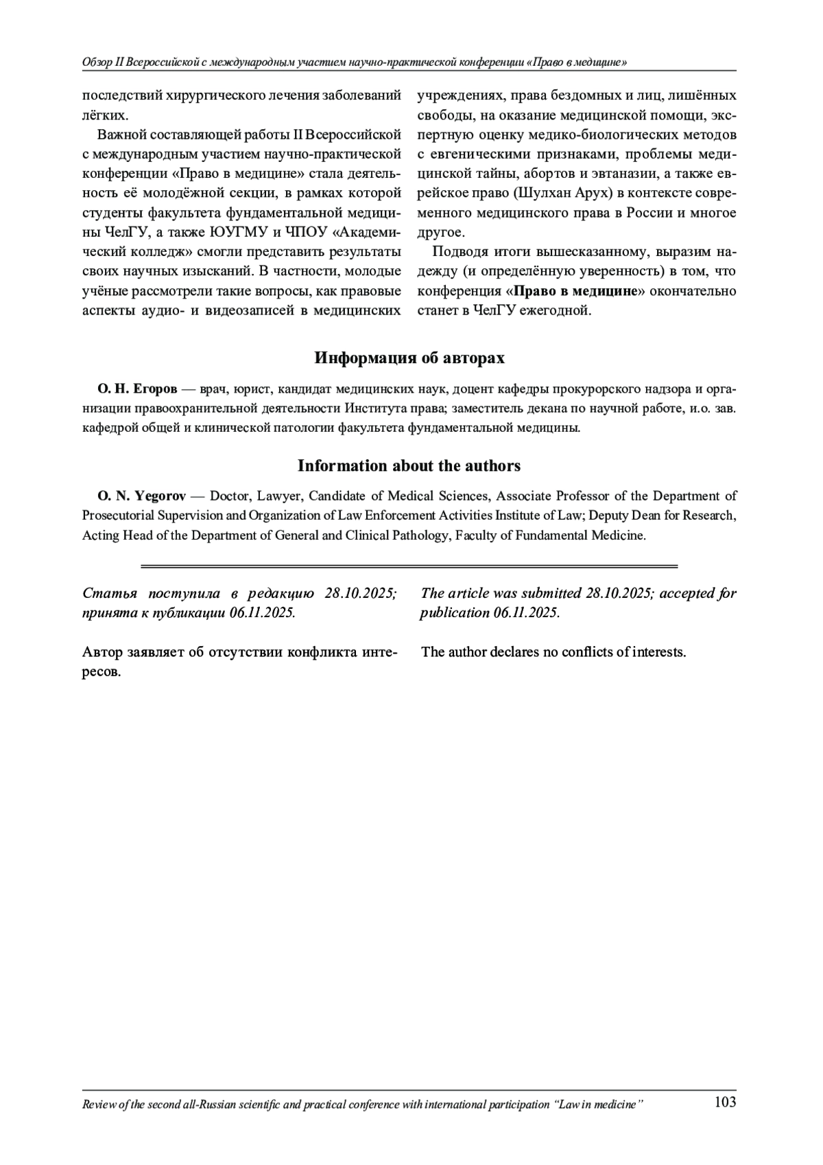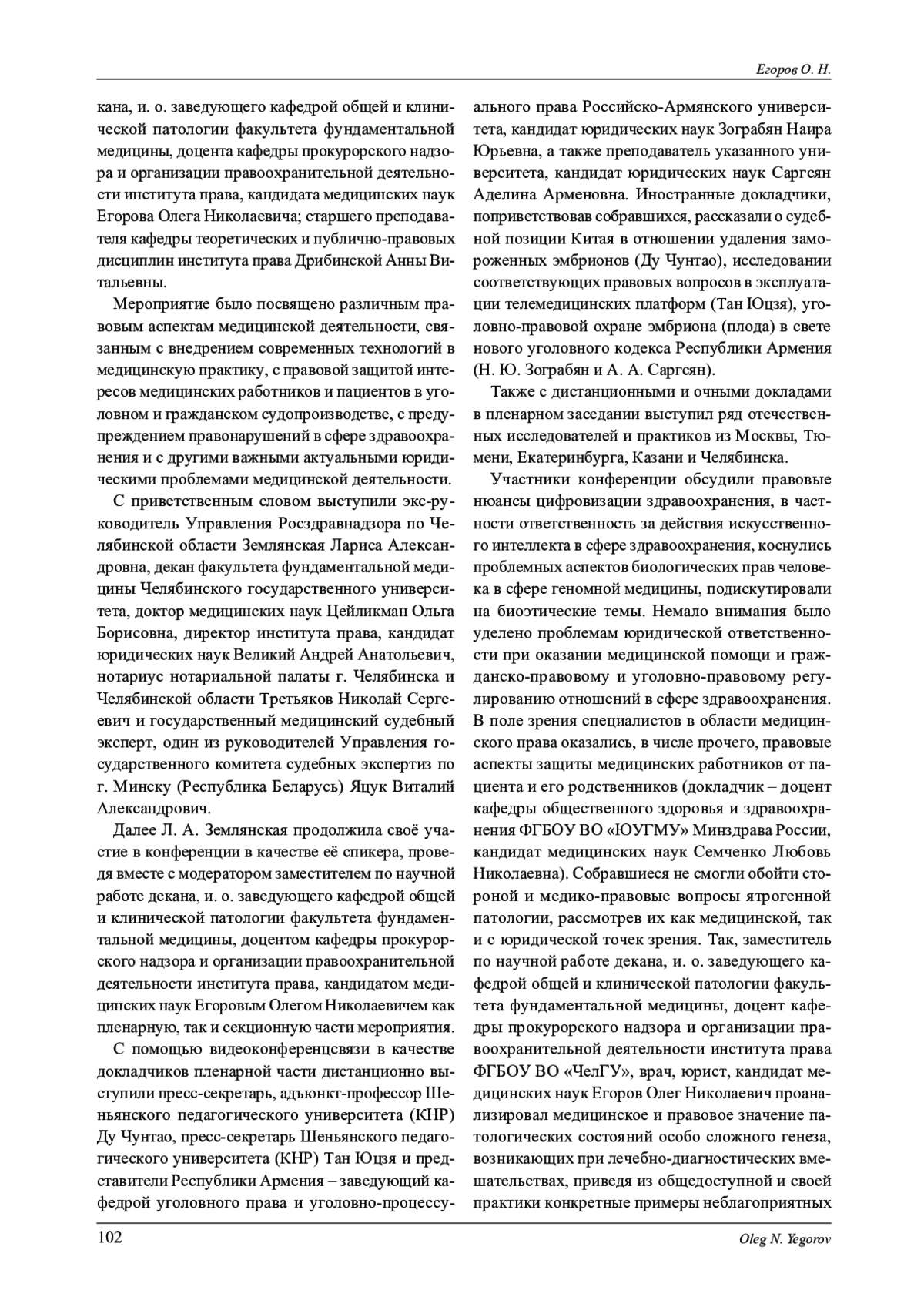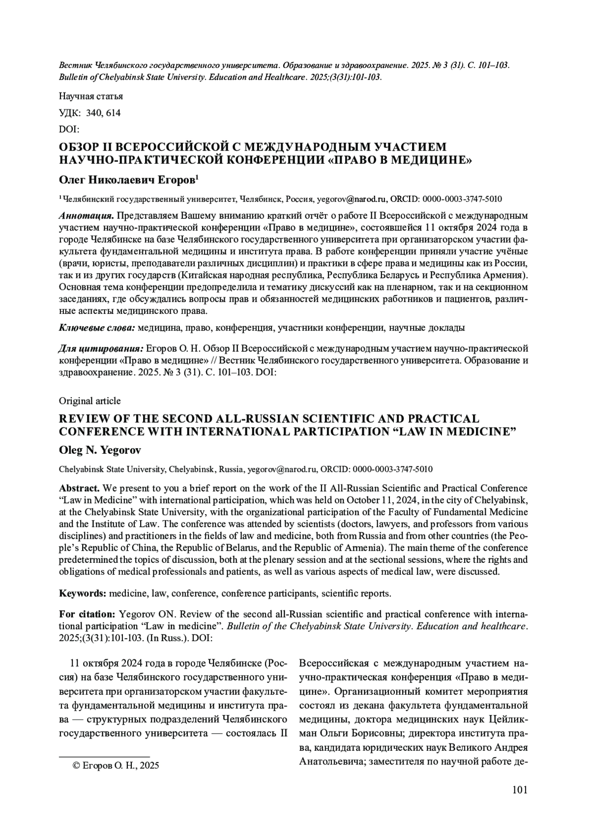 Представляем Вашему вниманию краткий отчёт о работе II Всероссийской с международным участием научно-практической конференции «Право в медицине», состоявшейся 11 октября 2024 года в городе Челябинске на базе Челябинского государственного университета при организаторском участии факультета фундаментальной медицины и института права. В работе конференции приняли участие учёные (врачи, юристы, преподаватели различных дисциплин) и практики в сфере права и медицины как из России, так и из других государств (Китайская народная республика, Республика Беларусь и Республика Армения). Основная тема конференции предопределила и тематику дискуссий как на пленарном, так и на секционном заседаниях, где обсуждались вопросы прав и обязанностей медицинских работников и пациентов, различные аспекты медицинского права.