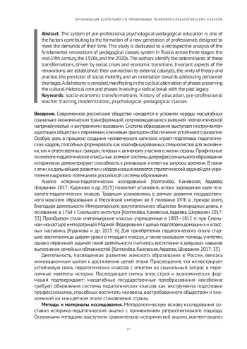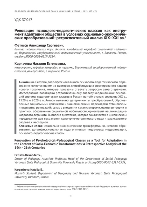 Система допрофессионального психолого-педагогического образования является одним из факторов, способствующих формированию кадров нового поколения, которые призваны отвечать запросам своего времени. Исследование посвящено ретроспективному анализу кардинальных реноваций системы педагогических классов в России на трёх этапах: середина XIX в., 1920-е и 2020-е гг. Авторы выявляют детерминанты преобразований, обусловленные социальными кризисами и экономическими переходами. Установлены инварианты реноваций: связь с внешними катализаторами, единство теории и практики, обеспечение социальной мобильности, ориентация на ликвидацию кадрового дефицита. Выявлена дихотомия, которая заключается в циклическом чередовании фаз сохранения культурно-исторического ядра и радикального разрыва с наследием.