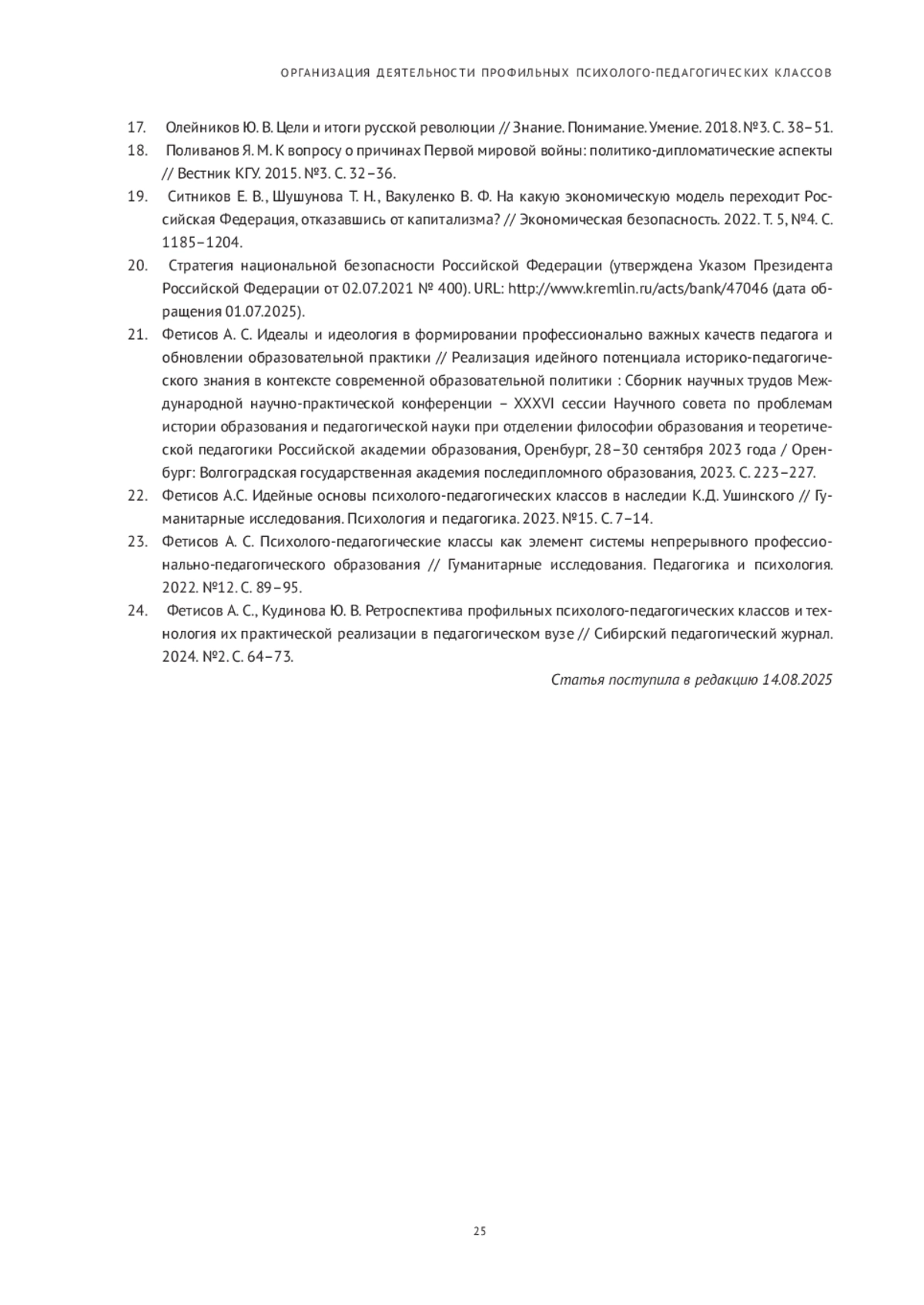 24. Фетисов А. С., Кудинова Ю. В. Ретроспектива профильных психолого-педагогических классов и технология их практической реализации в педагогическом вузе // Сибирский педагогический журнал. 2024. №2. С. 64-73. EDN: EFQLHK