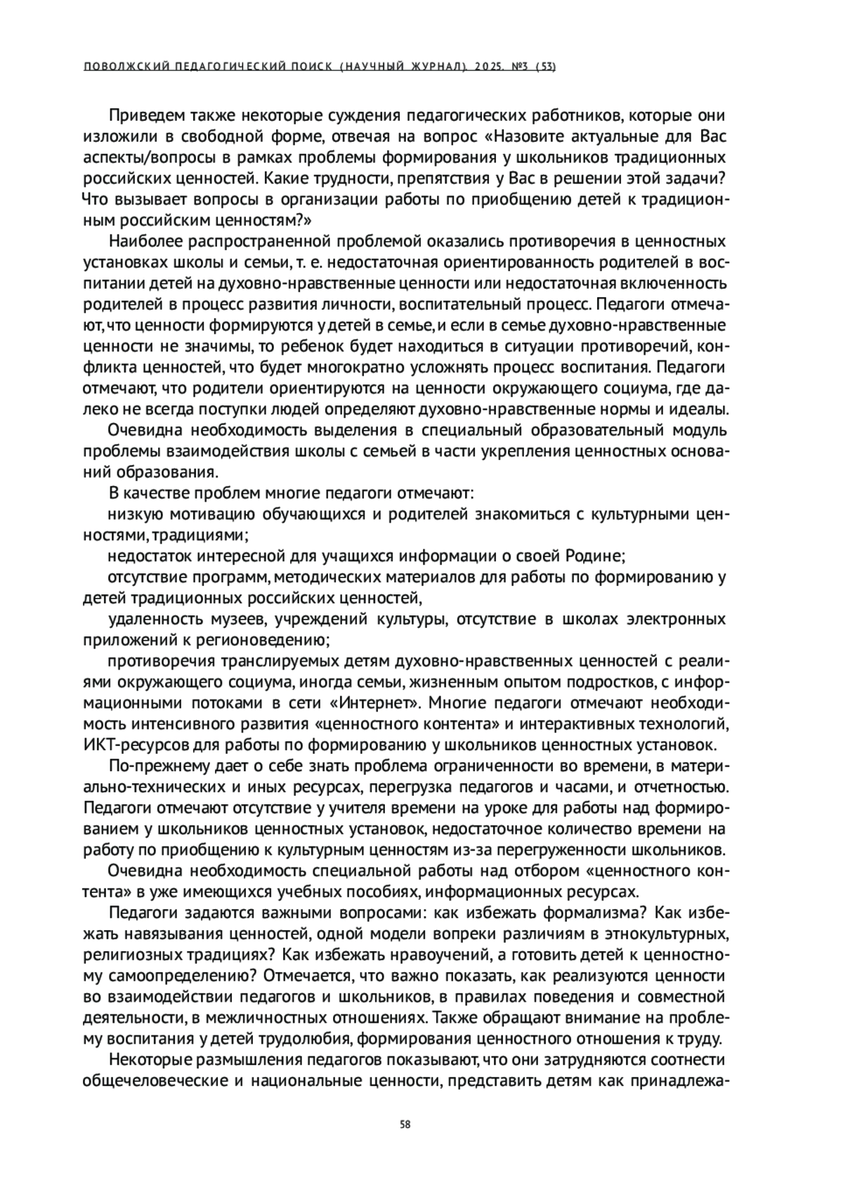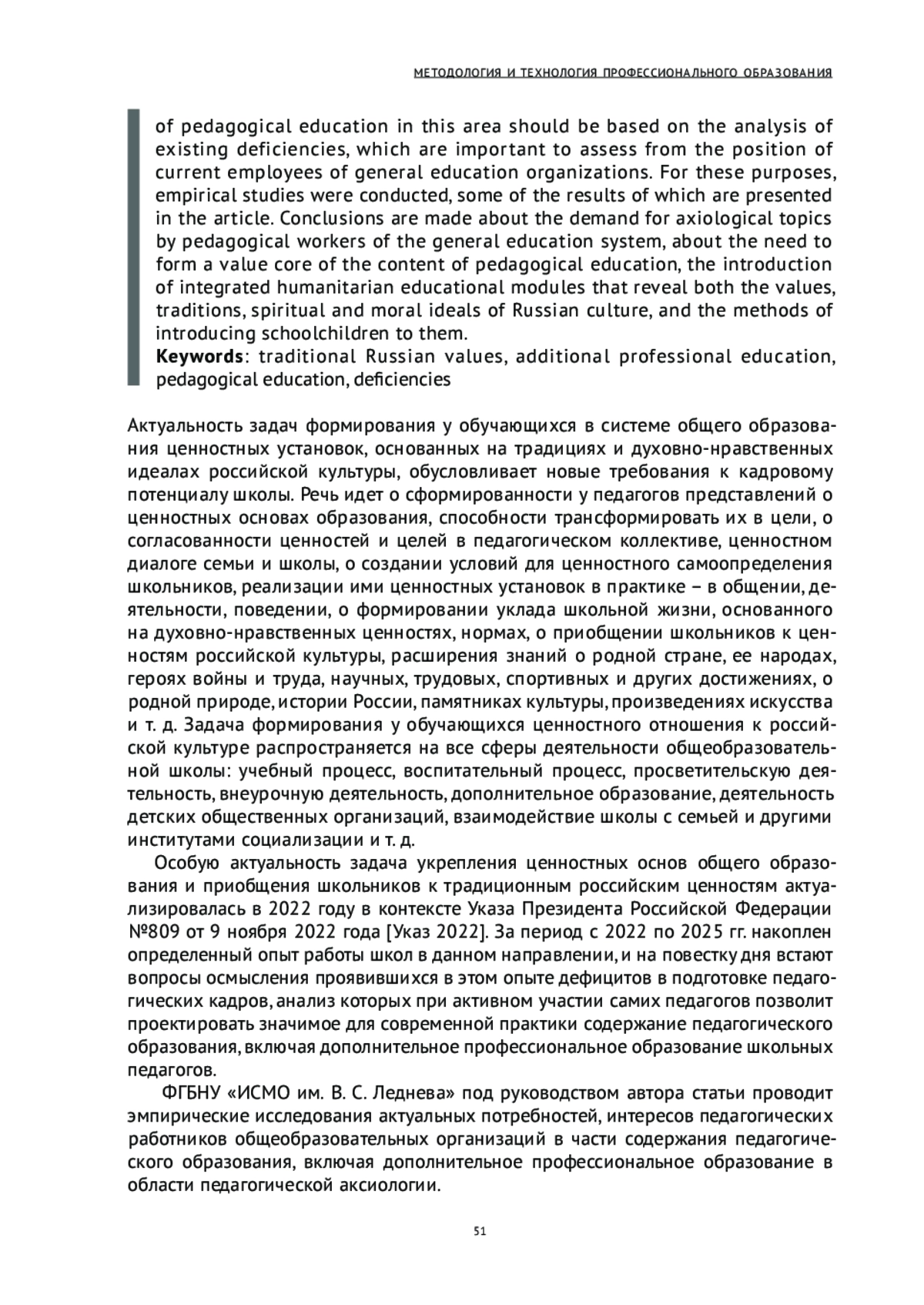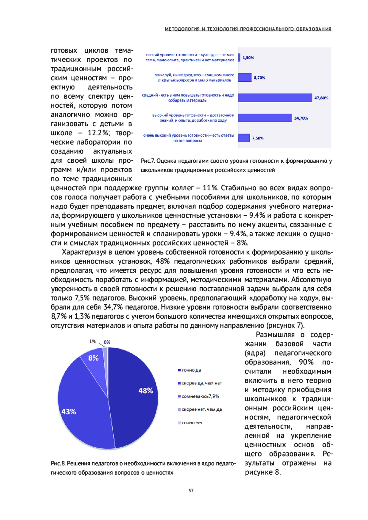 Условием эффективного решения школой актуальной сегодня задачи трансляции подрастающим поколениям традиционных российских ценностей является обеспечение ее кадрового потенциала в части готовности педагогов к формированию ценностных установок у школьников. Развитие содержания педагогического образования в данном направлении должно опираться на анализ имеющихся дефицитов, оценить которые важно с позиции действующих работников общеобразовательных организаций. В этих целях проведены эмпирические исследования, некоторые результаты которых представлены в статье. Сделаны выводы о востребованности аксиологической тематики педагогическими работниками системы общего образования, о необходимости формирования ценностного ядра содержания педагогического образования, введения интегрированных гуманитарных образовательных модулей, раскрывающих как ценности, традиции, духовно-нравственные идеалы российской культуры, так и методику приобщения к ним школьников.