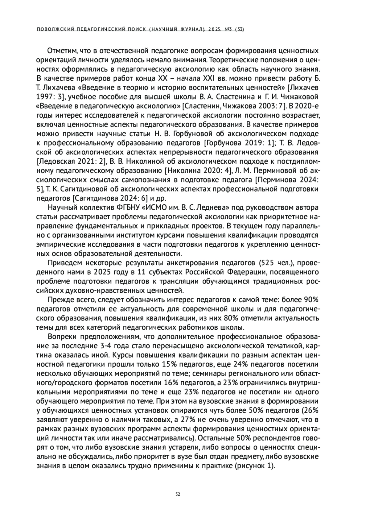 4. Николина В. В. Реализация аксиологического подхода в постдипломном профессиональном образовании педагога // Нижегородское образование. 2020. № 1. С. 11-18. EDN: TMPPFV
