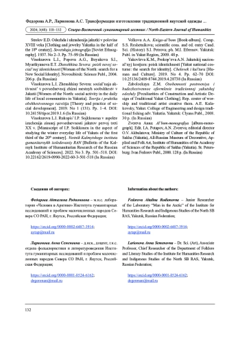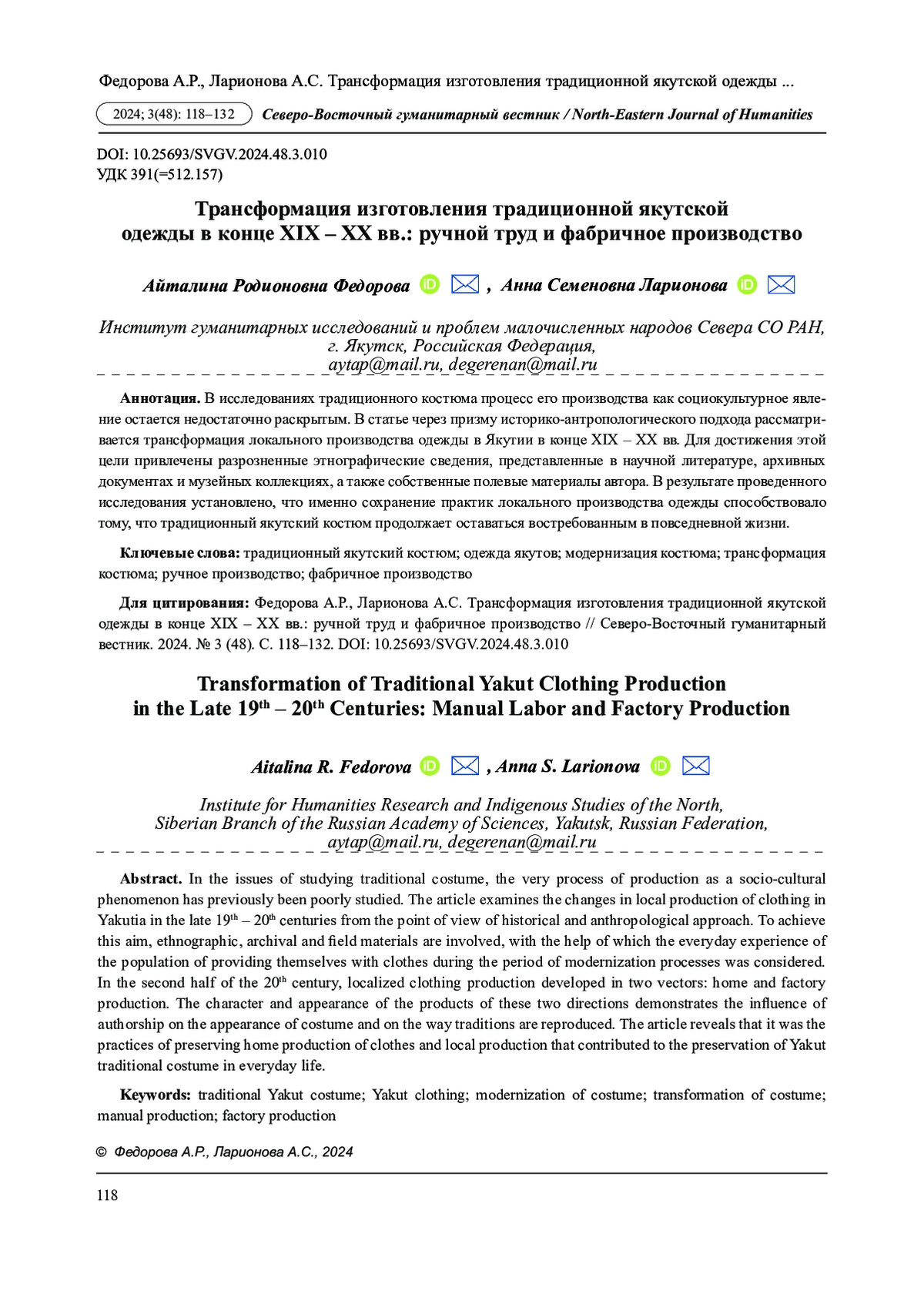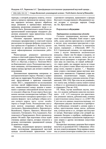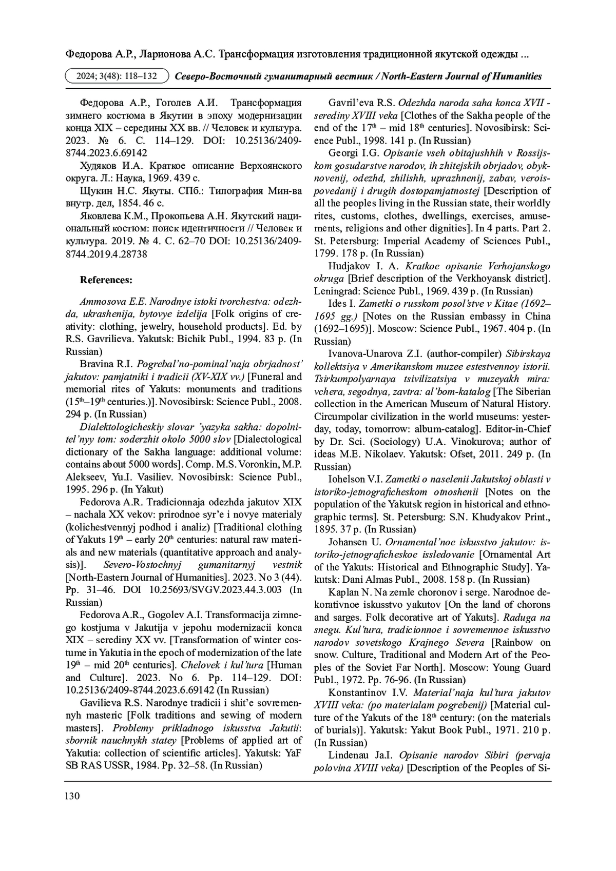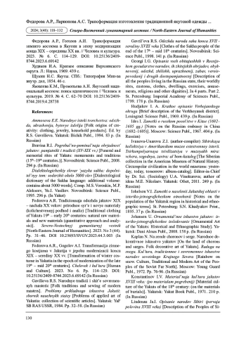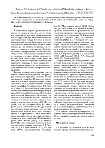 40. Федорова А.Р., Гоголев А.И. Трансформация зимнего костюма в Якутии в эпоху модернизации конца XIX - середины ХХ вв. // Человек и культура. 2023. № 6. С. 114-129. DOI: 10.25136/2409-8744.2023.6.69142 EDN: RIPYDX