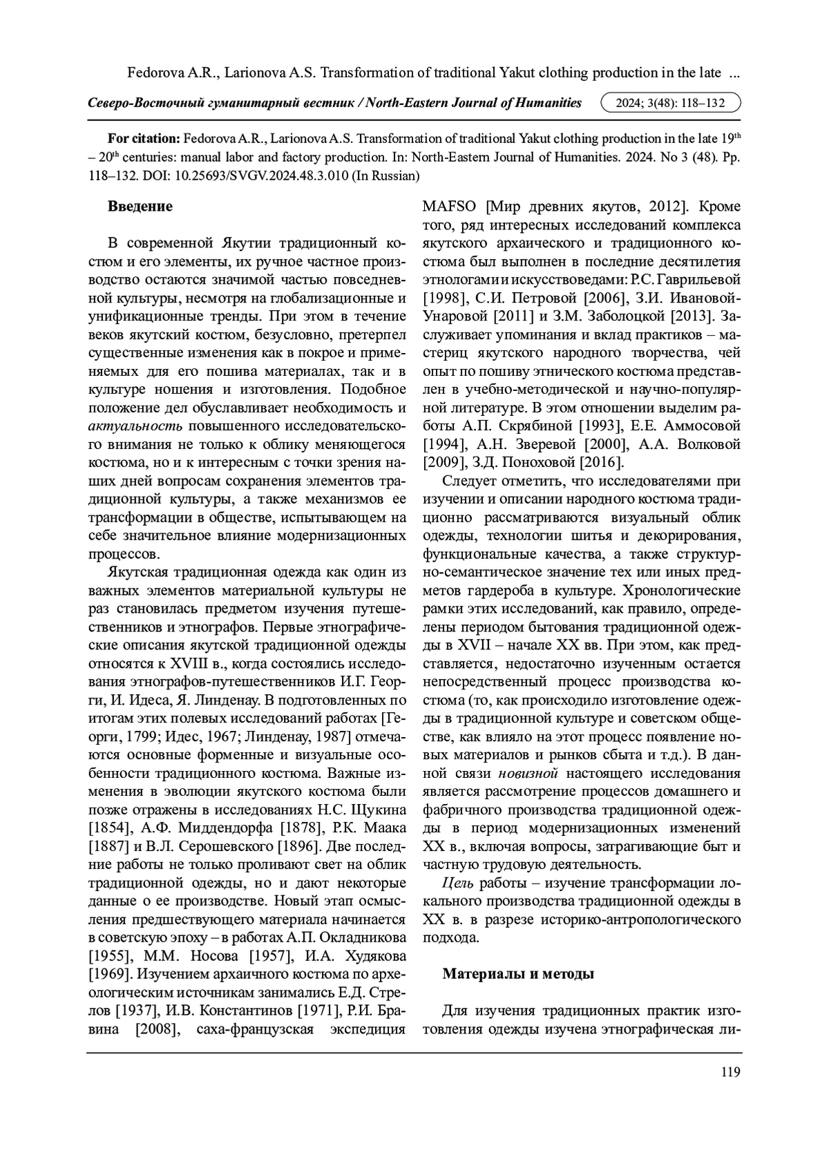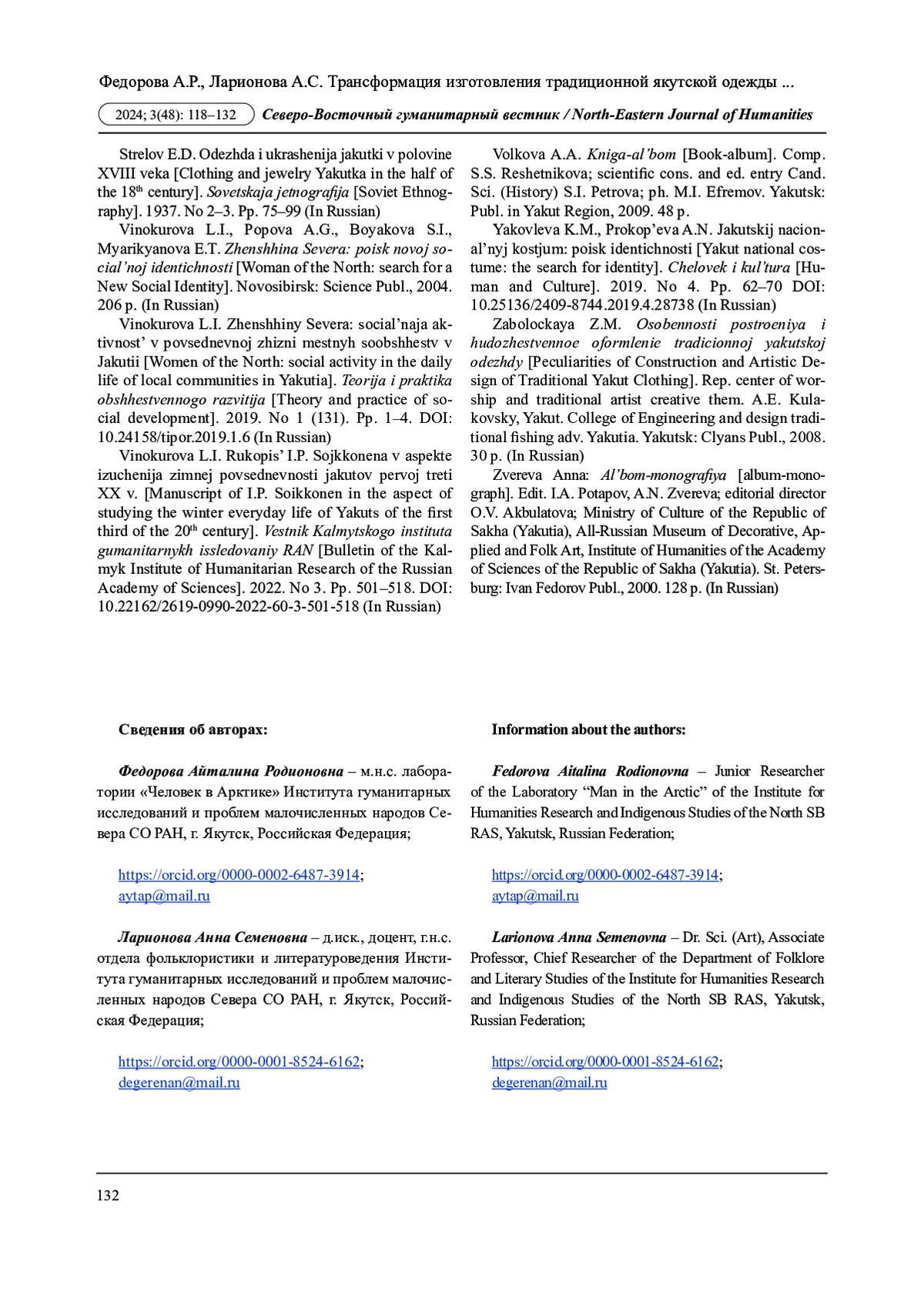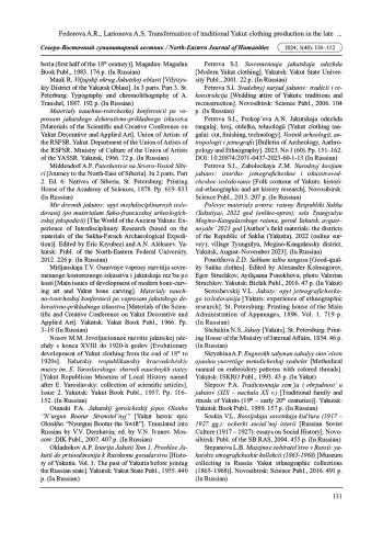 39. Федорова А.Р. Традиционная одежда якутов XIX - начала ХХ вв.: природное сырье и новые материалы (количественный подход и анализ) // Северо-Восточный гуманитарный вестник. 2023. № 3 (44). С. 31-46. DOI: 10.25693/SVGV.2023.44.3.003 EDN: NXOKDI