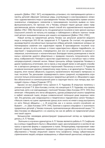 Известное высказывание А. П. Чехова о том, что он умеет «коротко говорить о длинных вещах» [Чехов 1976: 76], очень хорошо характеризует одну из особенностей его стиля – удивительную выразительность деталей. Отказавшись от подробно выписанных характеристик образов и положений, А. П. Чехов не только в прозе, но и в драме сделал носителем главного смысла деталь, которая у него, по мнению А. Белкина, «более многозначна и активна, чем у других великих художников слова» [Белкин 1973: 221]. В первую очередь высказанное замечание можно отнести к предметно-вещной детали, поскольку, как считает А. П. Чудаков, модель художественного мира писателя во многом зависит от того, какую роль в нем играет вещь [Чудаков 1971: 138].