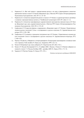 6. Маряхина Е. А. “Вот мой проект”: художественная деталь и ее роль в формировании семантики временного потока в пьесе А. П. Чехова “Вишневый сад” // Вестник РГГУ. Серия “Литературоведение. Языкознание. Культурология”. 2021. № 3. С. 53-64. EDN: RUVEJK