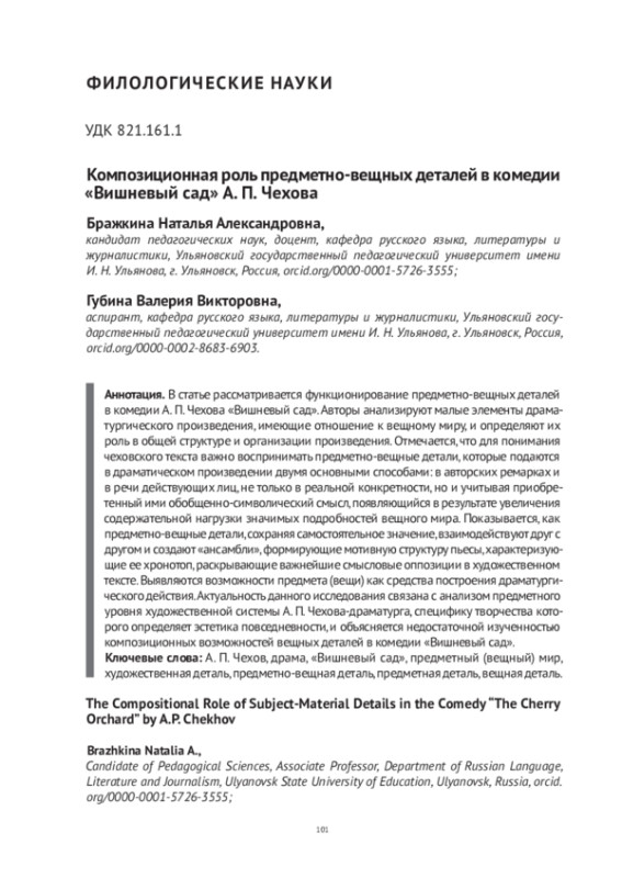В статье рассматривается функционирование предметно-вещных деталей в комедии А. П. Чехова «Вишневый сад». Авторы анализируют малые элементы драматургического произведения, имеющие отношение к вещному миру, и определяют их роль в общей структуре и организации произведения. Отмечается, что для понимания чеховского текста важно воспринимать предметно-вещные детали, которые подаются в драматическом произведении двумя основными способами: в авторских ремарках и в речи действующих лиц, не только в реальной конкретности, но и учитывая приобретенный ими обобщенно-символический смысл, появляющийся в результате увеличения содержательной нагрузки значимых подробностей вещного мира. Показывается, как предметно-вещные детали, сохраняя самостоятельное значение, взаимодействуют друг с другом и создают «ансамбли», формирующие мотивную структуру пьесы, характеризующие ее хронотоп, раскрывающие важнейшие смысловые оппозиции в художественном тексте. Выявляются возможности предмета (вещи) как средства построения драматургического действия. Актуальность данного исследования связана с анализом предметного уровня художественной системы А. П. Чехова- драматурга, специфику творчества которого определяет эстетика повседневности, и объясняется недостаточной изученностью композиционных возможностей вещных деталей в комедии «Вишневый сад».