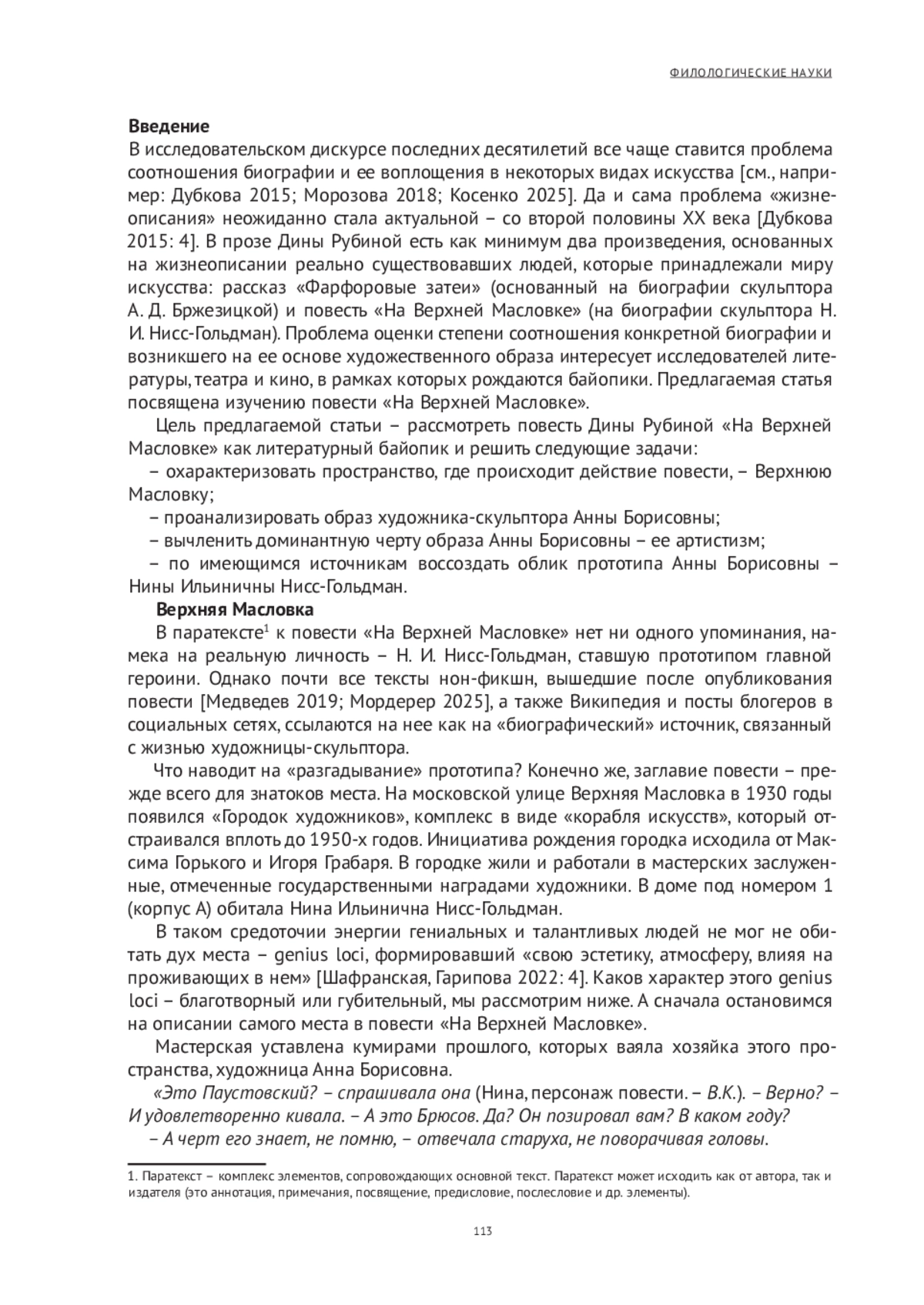 Художественное биографическое повествование в повести Дины Рубиной «На Верхней Масловке» рассматривается как литературный байопик. По канонам жанра, в основе байопика - судьба реального лица. Аналитика образа главной героини Анны Борисовны сопоставляется с реальной биографией художницы-скульптора Нины Ильиничны Нисс-Гольдман, прожившей жизнь почти в столетие (1892-1990). Отдельное внимание уделено пространству повести - атмосфере художественной мастерской, которая, будучи персонифицированной в некоем «духе места», диктует свои правила поведения для ее обитателей, привечая своих и расправляясь с чужими. Проблема соотношения реальной биографии и ее воплощения в художественном тексте актуальна для современного научного дискурса. Предлагаемый в статье ракурс анализа повести «На Верхней Масловке» проводится впервые.