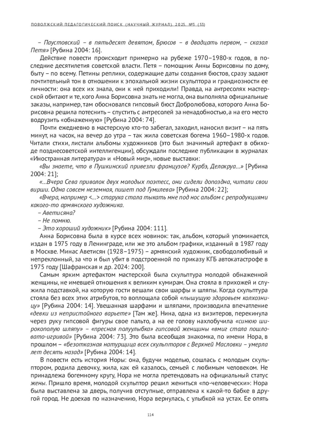 5. Косенко В. С. Литературный байопик: скульптор Аста Давидовна Бржезицкая в рассказе “Фарфоровые затеи” Дины Рубиной // Поволжский педагогический поиск. 2025. № 2. С. 132-140. EDN: OQBACX