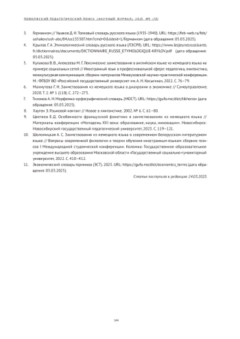 2. Веретенников И. А. Причины и этапы заимствования слов из немецкого языка // Язык. Образование. Культура: сборник научных трудов по материалам XVII Международной научно-практической электронной конференции. Курск: КГМУ, 2023. С. 371-373. EDN: VJHXDQ