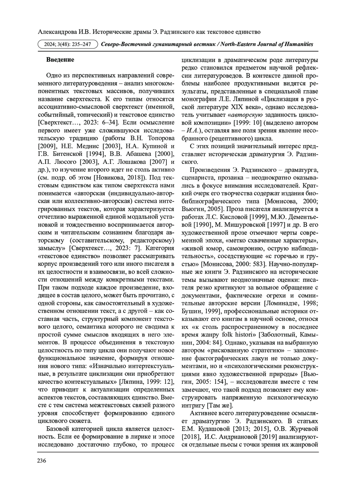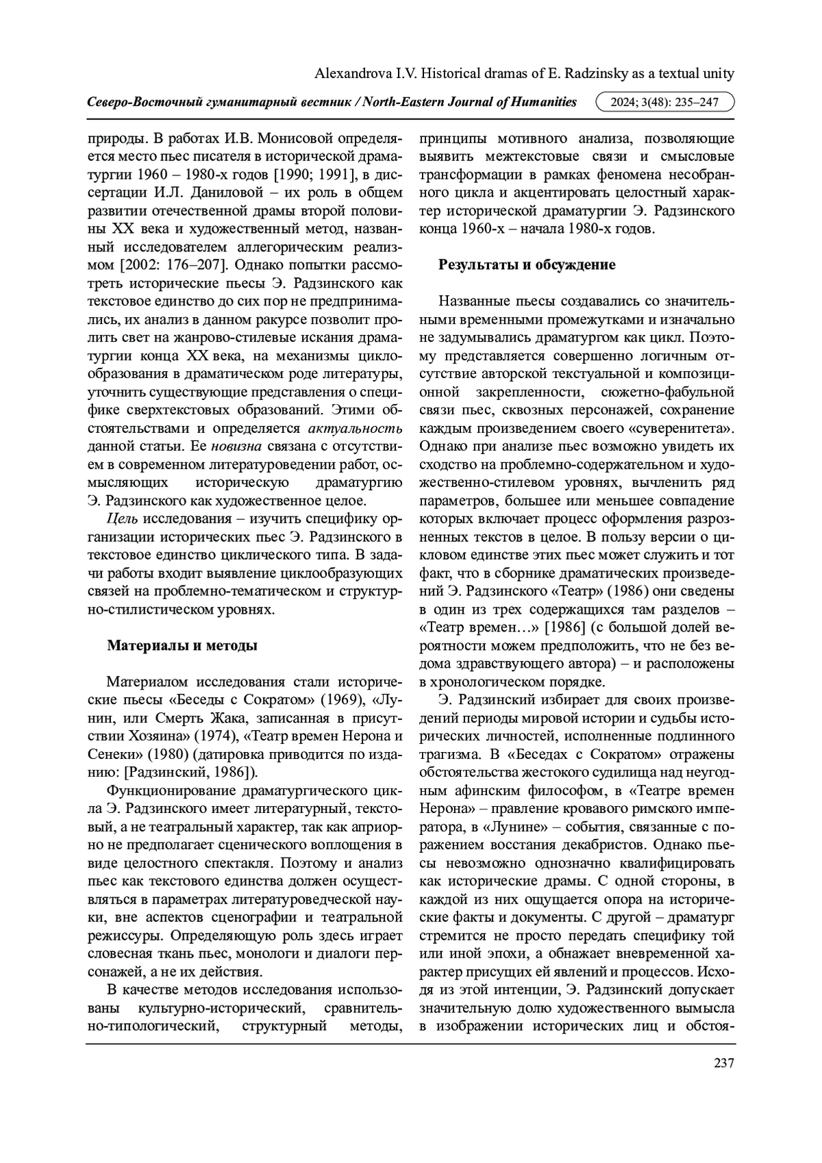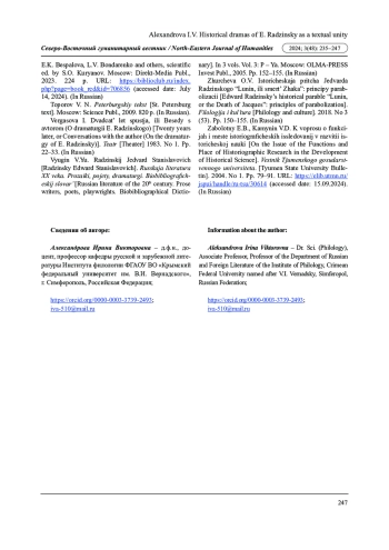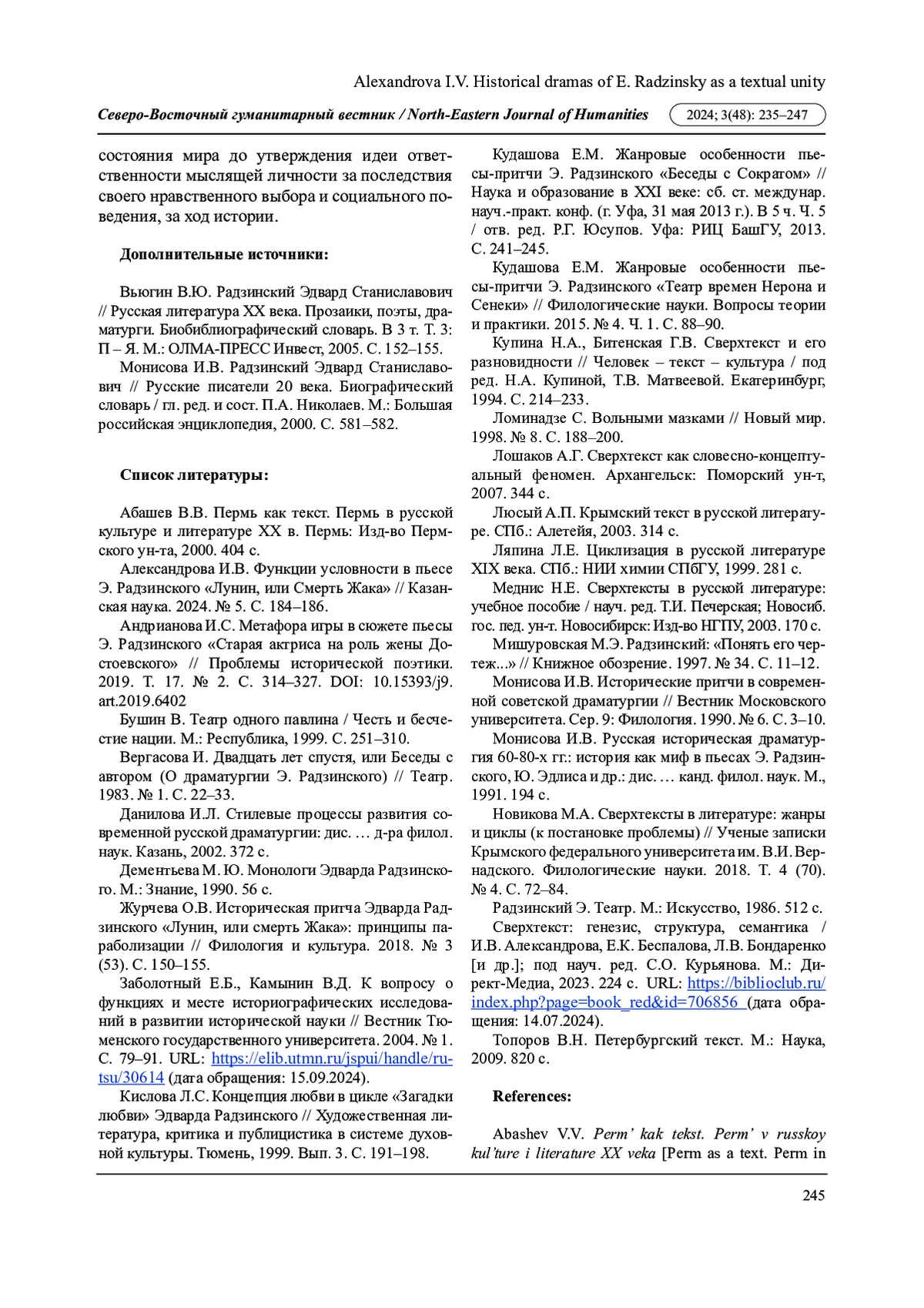 22. Монисова И.В. Исторические притчи в современной советской драматургии // Вестник Московского университета. Сер. 9: Филология. 1990. № 6. С. 3-10. Монисова И.В. Русская историческа драматургия 60-80-х гг.: история как миф в пьесах Э. Радзинского, Ю. Эдлиса и др.: дис. … канд. филол. наук. М., 1991. 194 с.