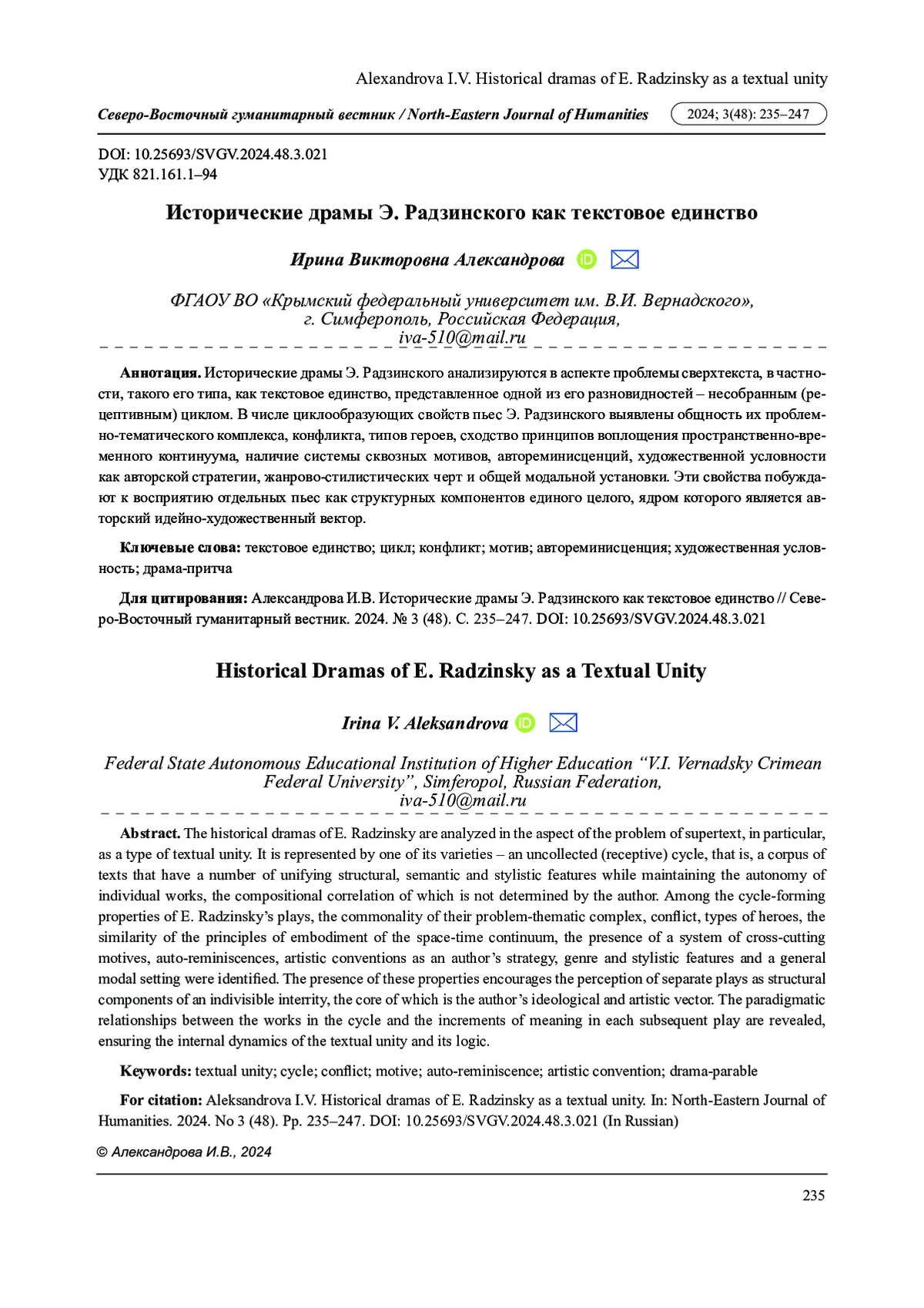 Исторические драмы Э. Радзинского анализируются в аспекте проблемы сверхтекста, в частности, такого его типа, как текстовое единство, представленное одной из его разновидностей - несобранным (рецептивным) циклом. В числе циклообразующих свойств пьес Э. Радзинского выявлены общность их проблемно-тематического комплекса, конфликта, типов героев, сходство принципов воплощения пространственно-временного континуума, наличие системы сквозных мотивов, автореминисценций, художественной условности как авторской стратегии, жанрово-стилистических черт и общей модальной установки. Эти свойства побуждают к восприятию отдельных пьес как структурных компонентов единого целого, ядром которого является авторский идейно-художественный вектор.