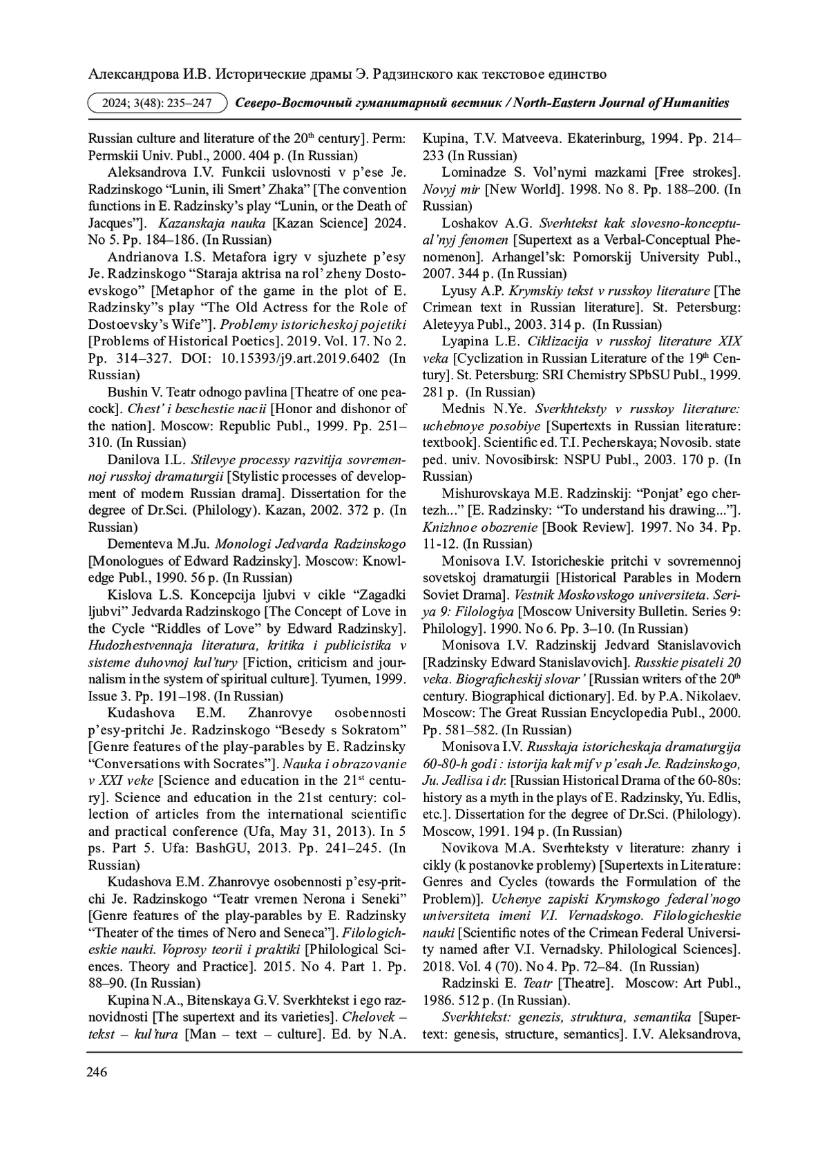 14. Кудашова Е.М. Жанровые особенности пьесы-притчи Э. Радзинского “Театр времен Нерона и Сенеки” // Филологические науки. Вопросы теории и практики. 2015. № 4. Ч. 1. С. 88-90. EDN: TKVFZJ