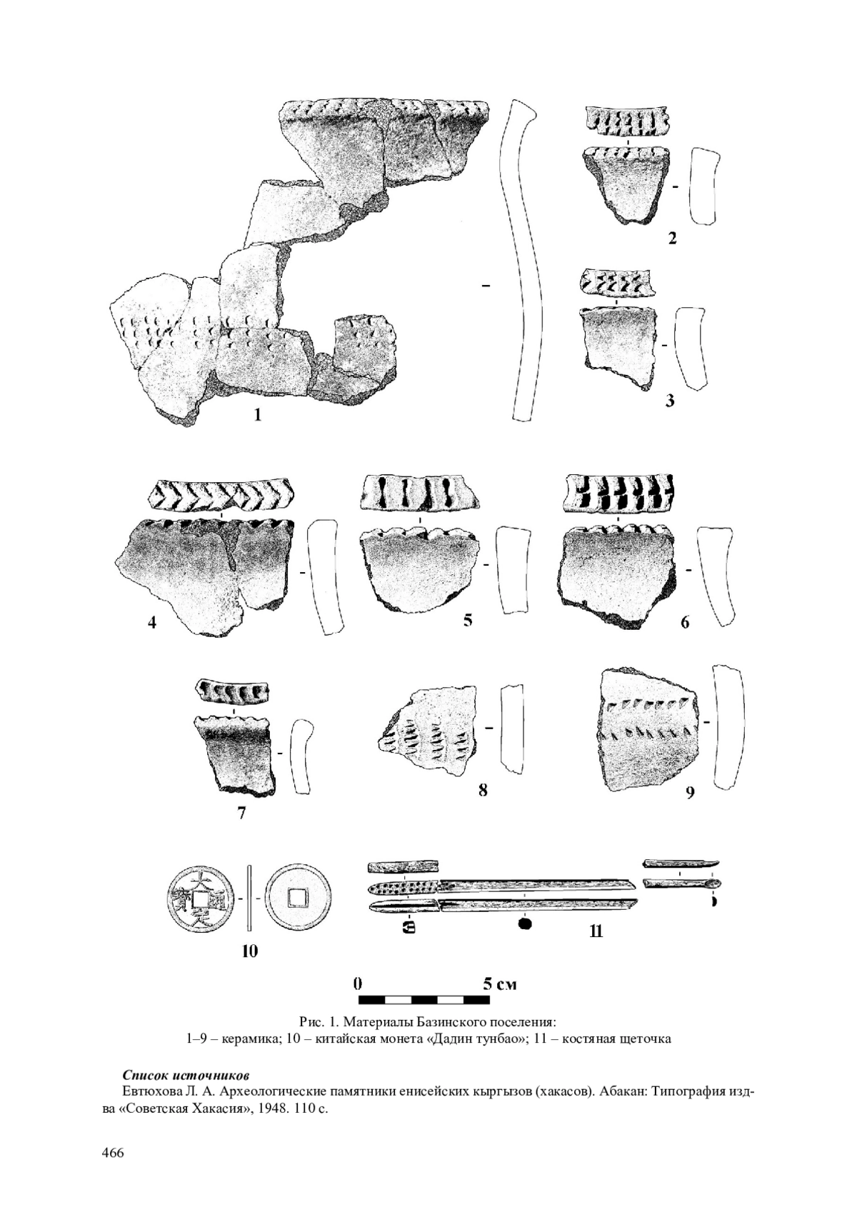 Исследование Базинского поселения позволило выделить керамику развитого и позднего средневековья Хакасско-Минусинского края, которая раннее была практически не известна. Сосуды в основном имели горшковидную форму и различные типы штампа, нанесенные под углом на верхнюю поверхность венчика. К настоящему времени находки подобной керамики увеличиваются.