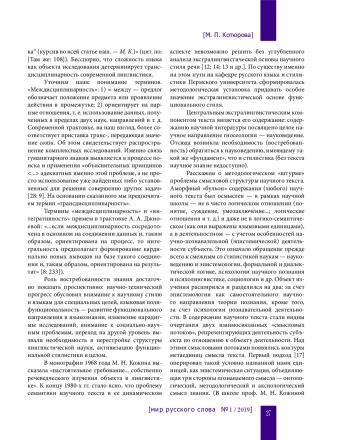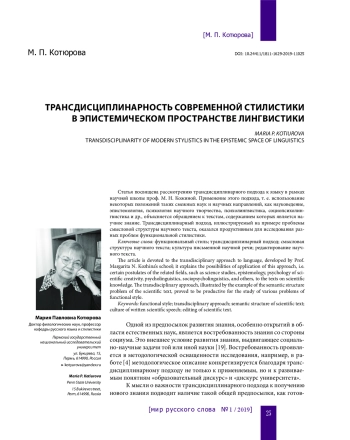 Статья посвящена рассмотрению трансдисциплинарного подхода к языку в рамках научной школы проф. М. Н. Кожиной. Применение этого подхода, т. е. использование некоторых положений таких смежных наук и научных направлений, как науковедение, эпистемология, психология научного творчества, психолингвистика, социопсихолингвистика и др., объясняется обращением к текстам, содержанием которых является научное знание. Трансдисциплинарный подход, иллюстрируемый на примере проблемы смысловой структуры научного текста, оказался продуктивным для исследования разных проблем функциональной стилистики