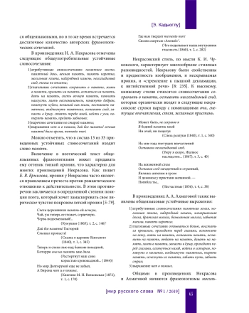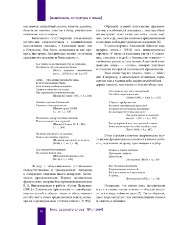 В статье рассматриваются устойчивые словосочетания с семантическим компонентом «память» в поэтическом языке Н. А. Некрасова и А. А. Ахматовой. Выявляются общеупотребительные и авторские фразеологизмы со значением «память/забвение» в творчестве обоих поэтов, определяется их роль в создании поэтического идиостиля. Определяются черты сходства и различия данных фразеологизмов у Некрасова и Ахматовой, частотность их употребления. Как показывает исследование, фразеология памяти отражает особенности мировоззрения поэтов, характеризует их отношение к времени, создает особый эмоциональный настрой