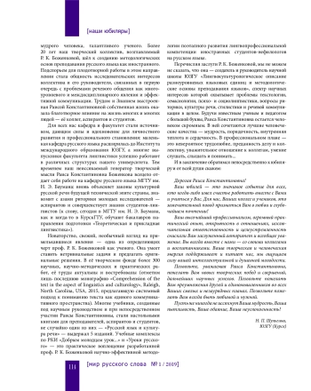 Имя Раисы Константиновны Боженковой — академика РАЕН, доктора филологических наук, профессора — по праву вплетено в летопись не только ЮгоЗападного государственного университета, но и современной русистики. Почетный работник высшего профессионального образования РФ, кавалер медали К. Д. Ушинского «За заслуги в области педагогических наук», обладатель почётных званий «Заслуженный деятель науки и образования» (РАЕ) и «Рыцарь науки и искусств» (РАЕН) и др. — полный список её регалий не уместить и на странице, однако, по нашему глубокому убеждению, все эти звания — лишь скромная награда за пройденный путь, вымощенный Трудом и Знанием. И сегодня мы — все те, кому судьба подарила счастье работать рядом с Раисой Константиновной или учиться у нее, — хотим признаться в уважении и бесконечной любви к прекрасному человеку, пытливому учёному, истинному учителю, чтобы не затерялись, не канули в Лету Слова и Дела