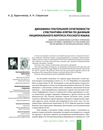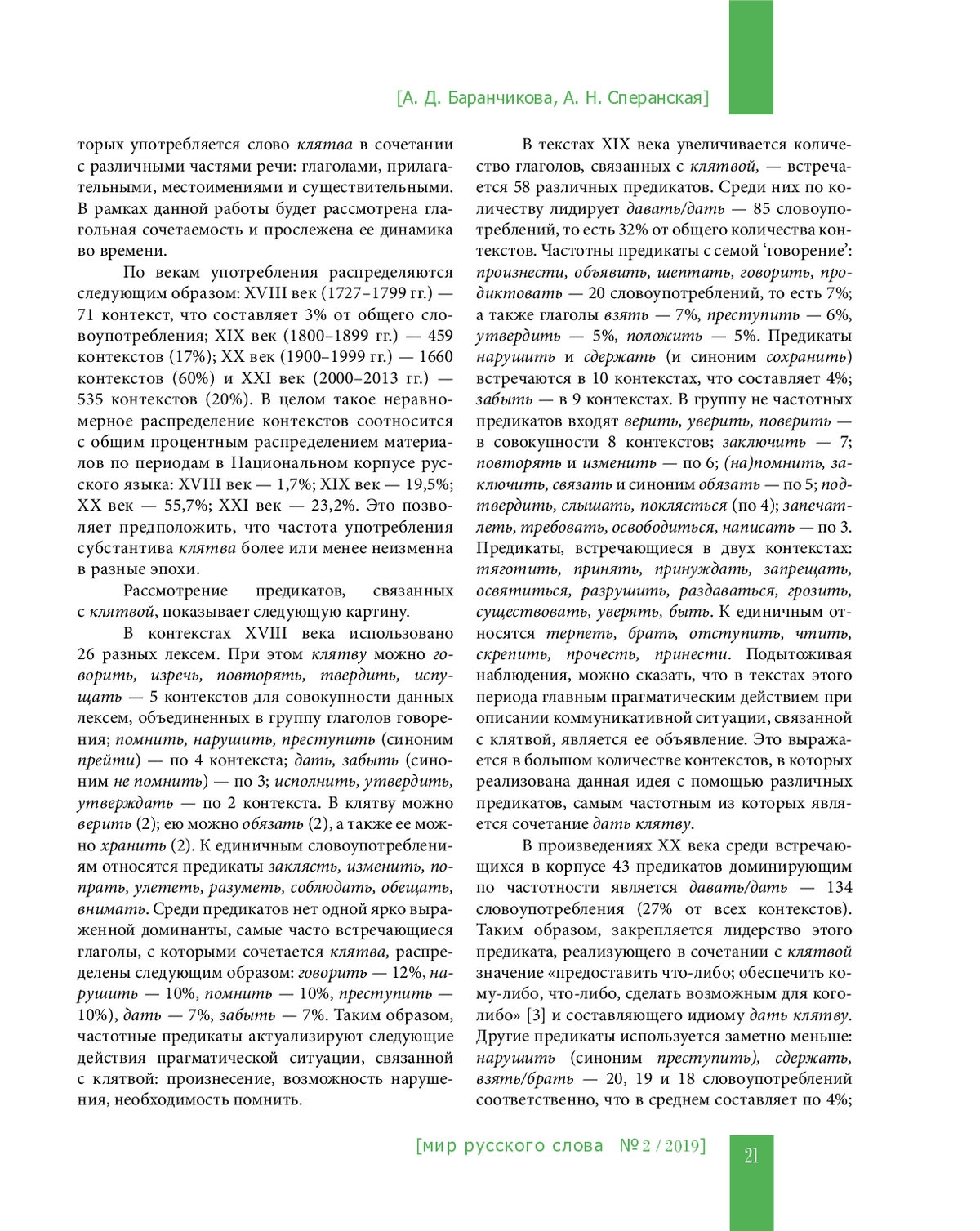 В статье исследована частотность сочетаний лексемы клятва с глаголами. Рассмотрена динамика изменения данных словоупотреблений на материале Национального корпуса русского языка на протяжении XVIII–XXI вв. Выявлены предикаты, называющие наиболее частотные прагматические действия при описании коммуникативной ситуации, связанной с клятвой