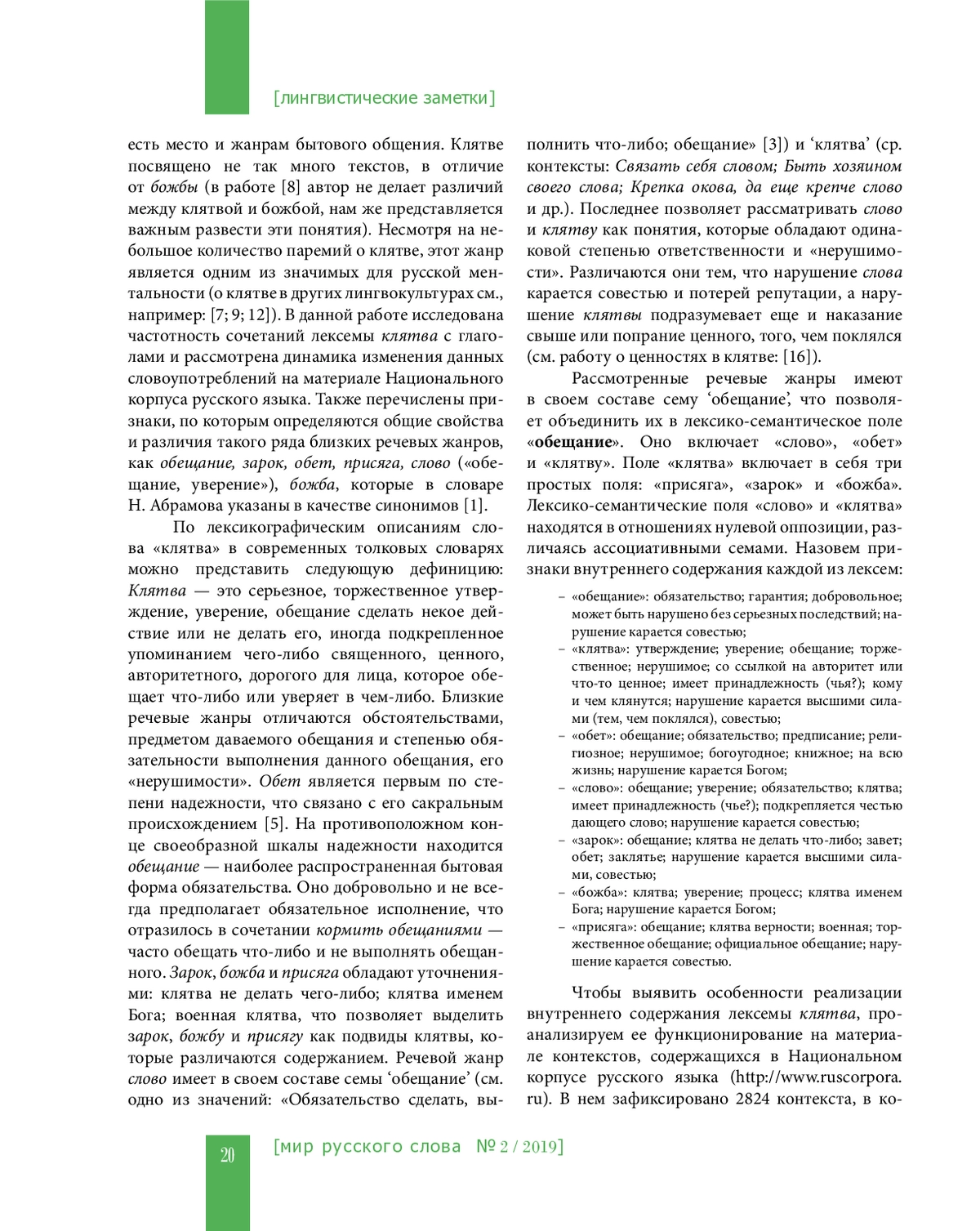 За последние несколько лет вышли сразу несколько статей разных авторов, посвященных клятве [11; 12; 15]. Подробное исследование было осуществлено Н. Ш. Галлямовой, в нем рассмотрены иллокутивные цели обещания и клятвы по авторской методике описания [4]. Такое внимание к субстантиву клятва имеет, возможно, внелингвистические причины — актуализировалась социальная сторона этого речевого действия. Перформатив клянусь и идиома даю клятву принадлежат к классу комиссивов, которые выражают обещания и другие взятые на себя обязательства [10]. Глаголы обещать, давать (честное) слово, сулить, клясться, обязываться ориентированы в будущее и предполагают передачу адресату слова, которое рассматривается как залог того, что сказанное будет обязательно выполнено [2]. В. И. Карасик выделил четыре базовых типа комиссивов: обиходные, ритуальные, институциональные и гарантийные