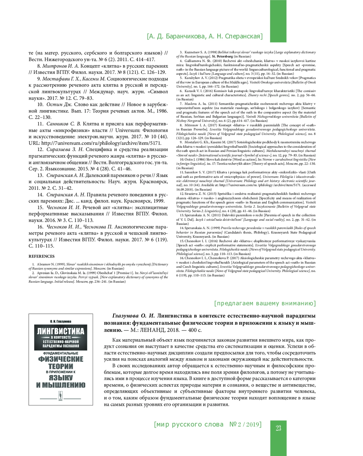 16. Чесноков И. И., Чеснокова П. Аксиологические параметры речевого акта «клятва» в русской и чешской лингвокультурах // Известия ВГПУ. Филол. науки. 2017. № 6 (119). С. 110-115.